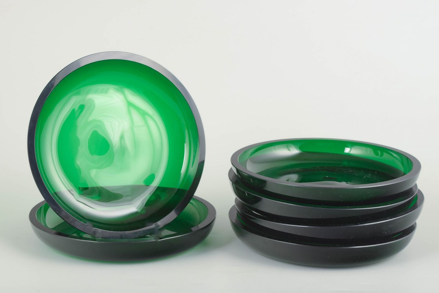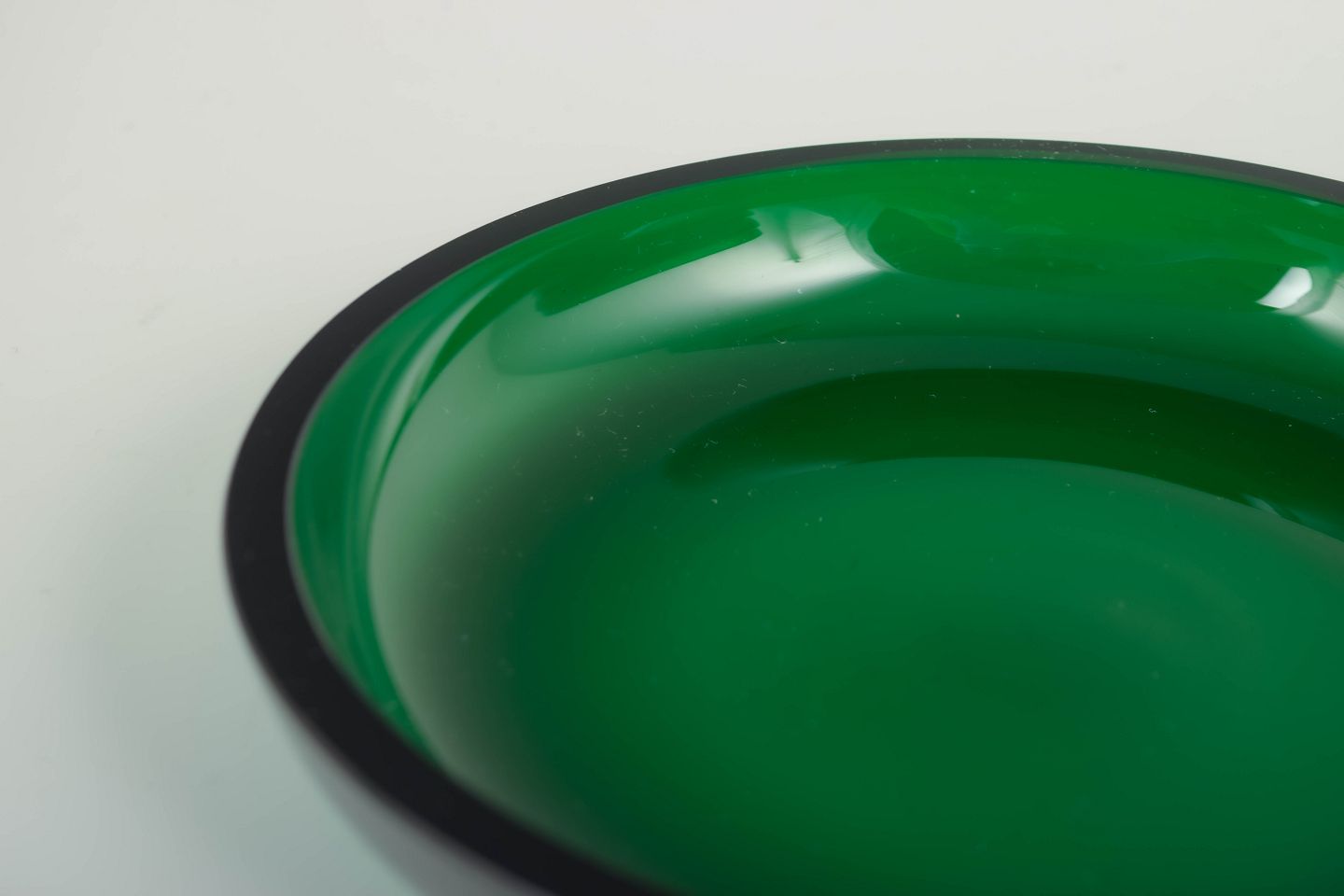 Beautiful plates in deep emerald-green art glass with swirling organic colour play and a thicker dark rim. A decorative and rare set from Svenskt Tenn, characteristic of Josef Frank’s playful and colourful design language.