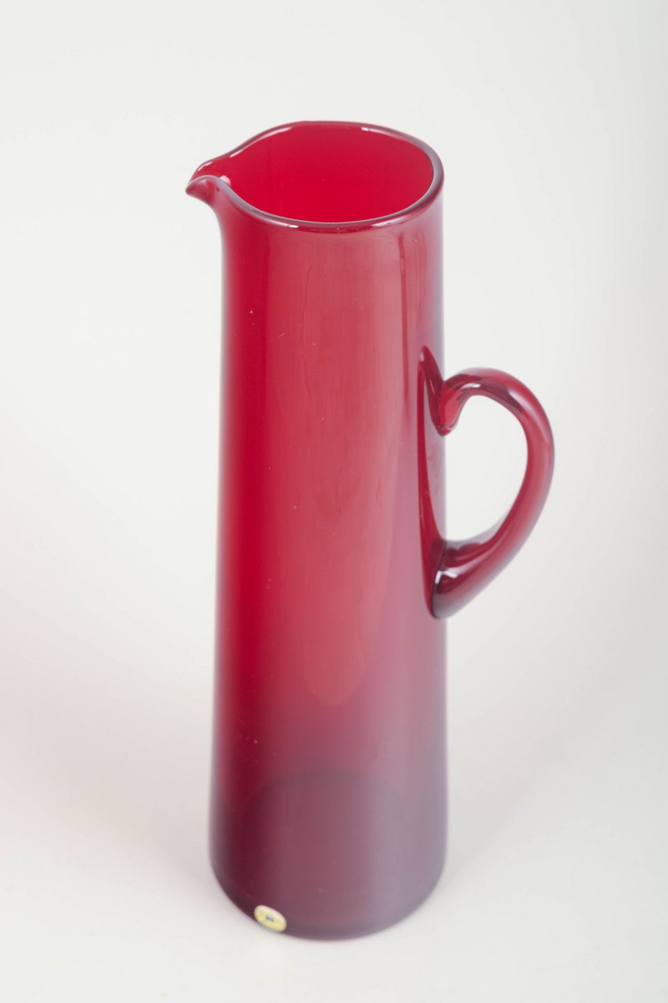 Tall cylindrical art-glass pitcher in deep ruby-red glass with a gracefully curved handle and small pouring spout. With original Reijmyre label.
