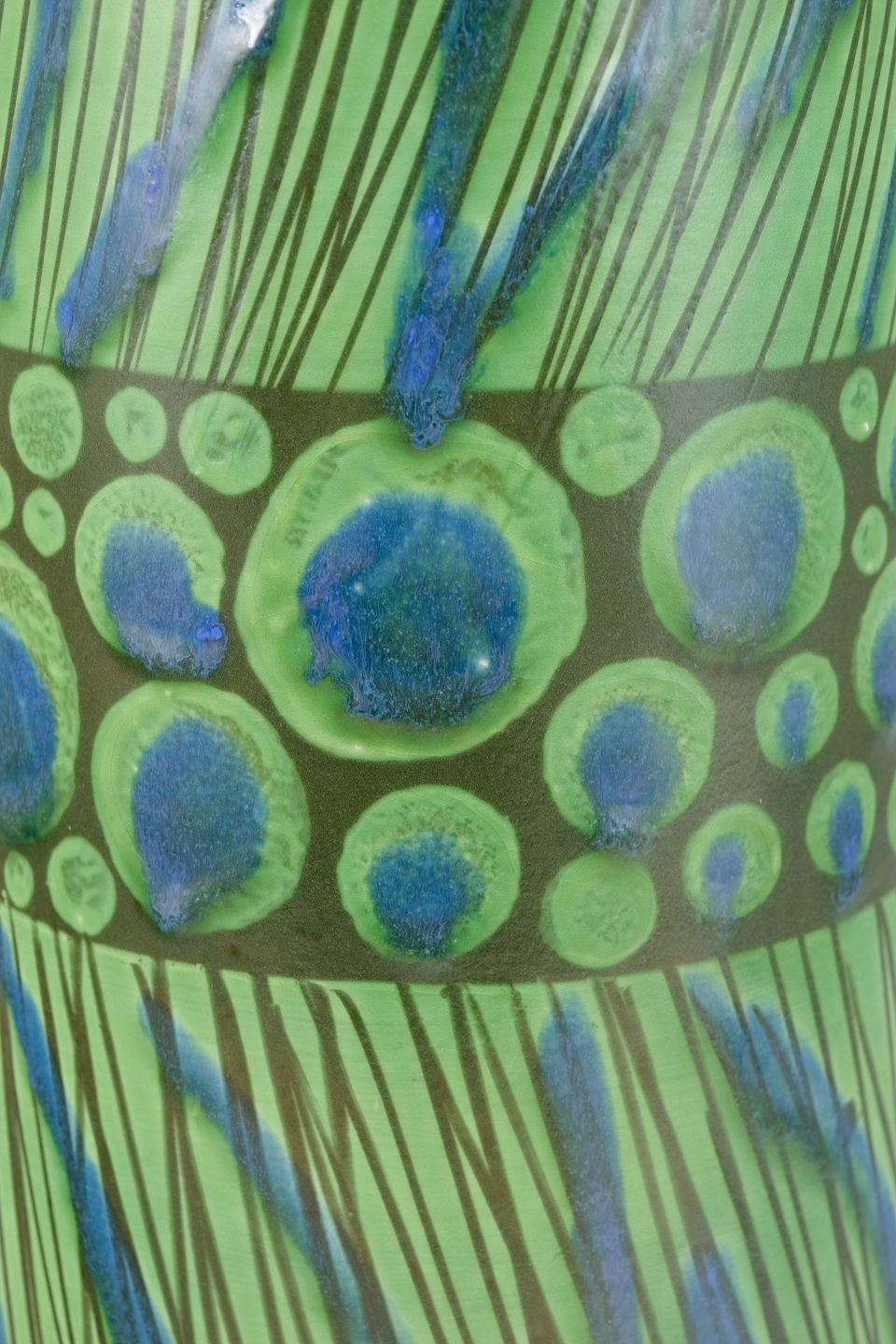 Rare and monumental ceramic vase by Göran Andersson for Upsala-Ekeby, created in the 1960s. Cylindrical form with vivid hand-painted decoration in green and blue tones, featuring a distinctive band of concentric relief circles. A unique piece from the period – exceptional in both size and artistic expression.