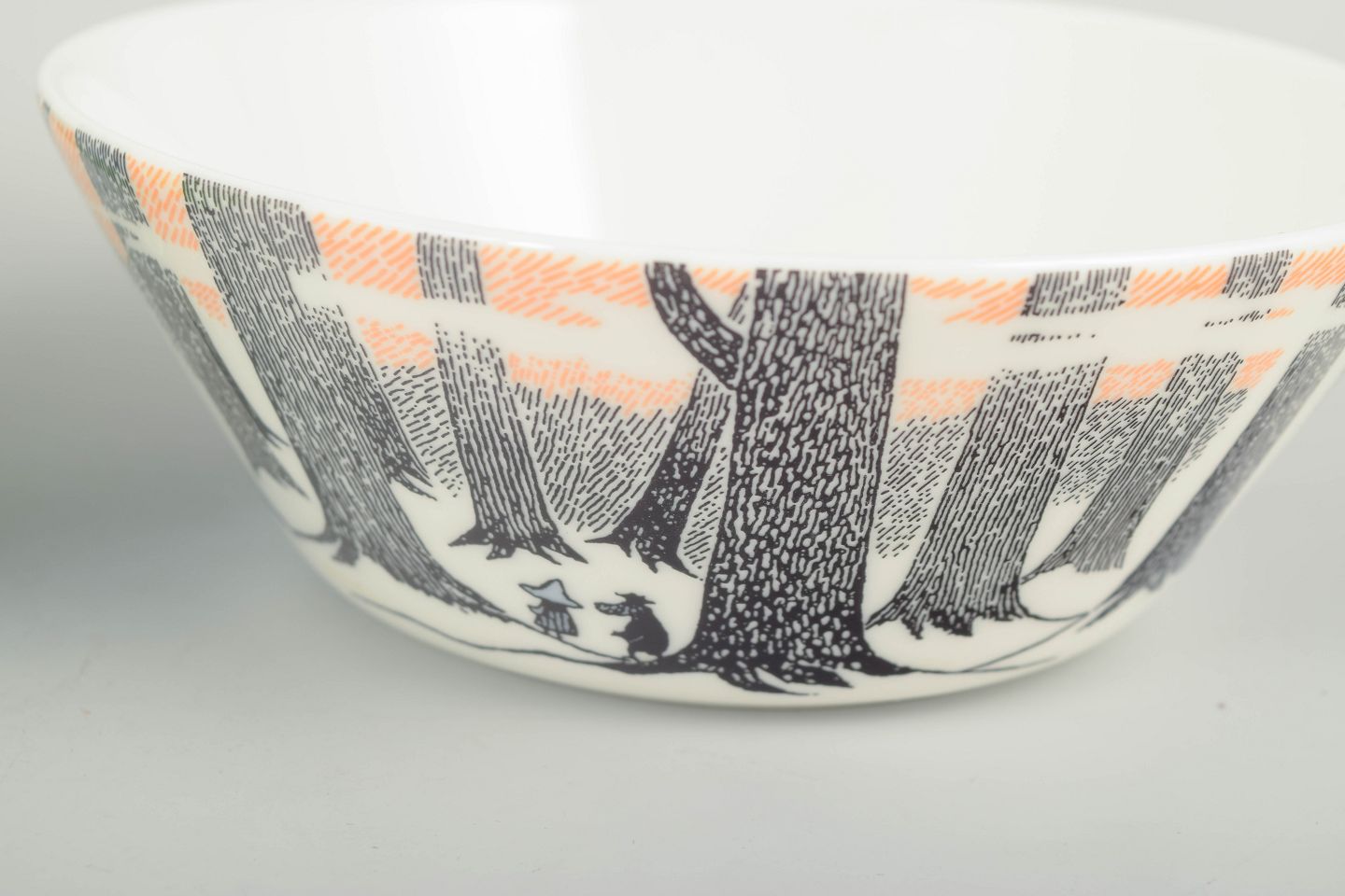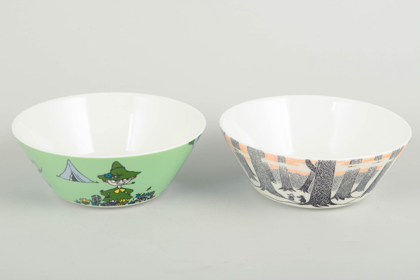 Two decorative porcelain Moomin bowls by Arabia Finland. One bowl in light green with Snufkin and a tent motif; the other features a graphic forest design in black, white and orange, inspired by Tove Jansson’s original illustrations.