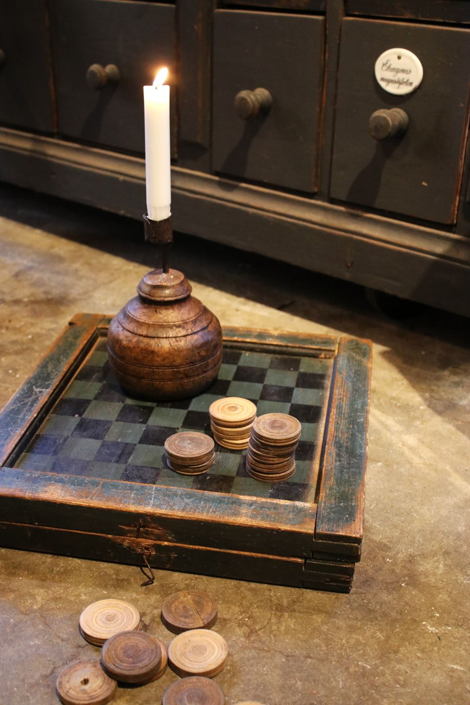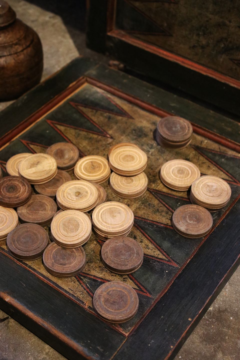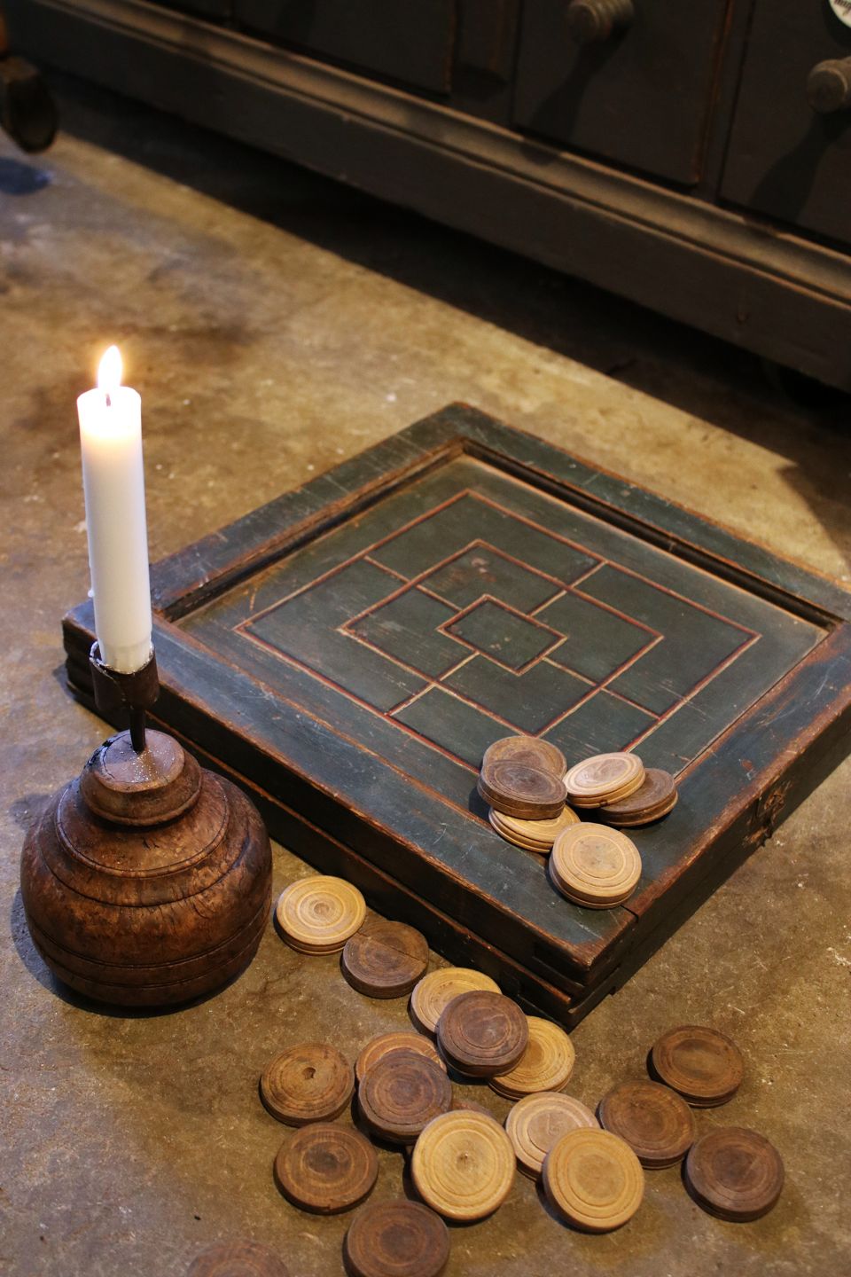 Charming antique 19th century game box / board game in painted wood with 3 different games. Has a super nice patina.The box measures H: 6cm. 36x35cm. (incl. 30 pieces of game pieces)