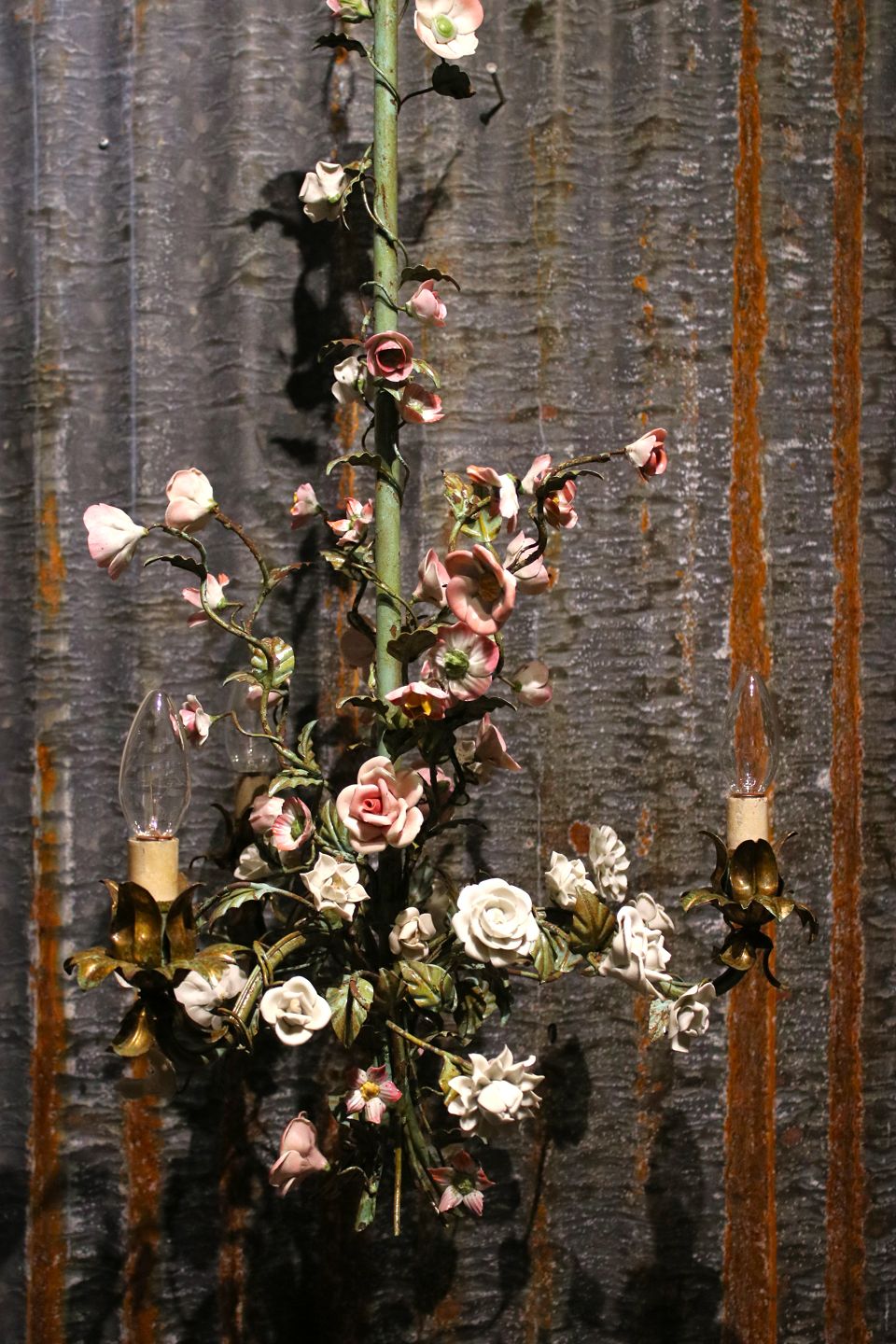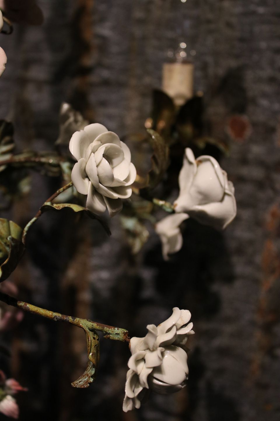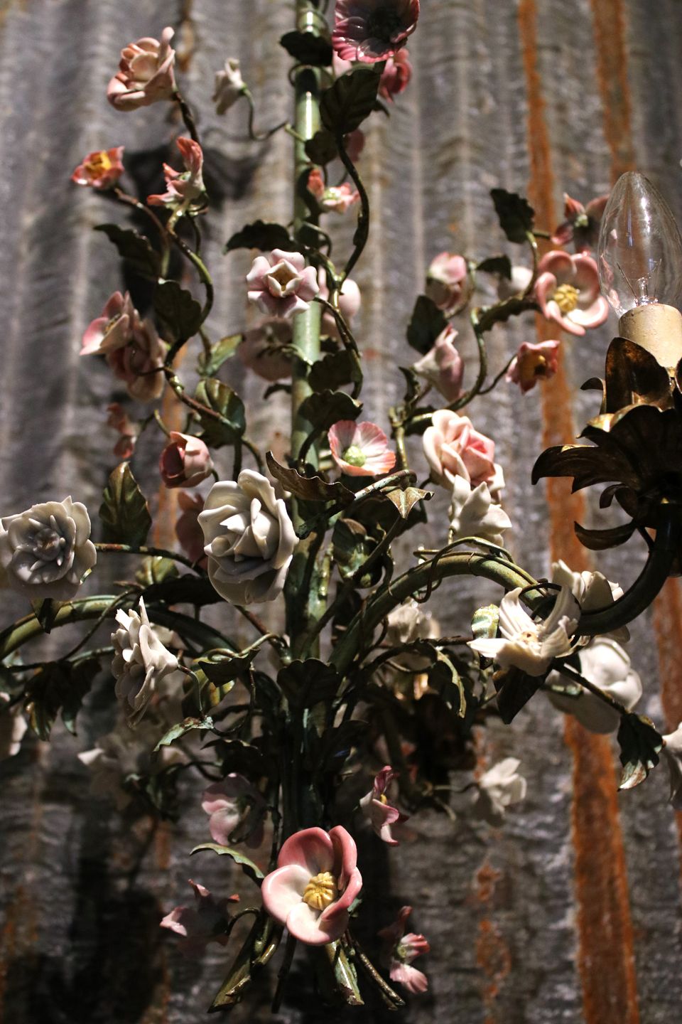 Old French chandelier with a base in green painted metal frame decorated with a lot of small fine colored / white porcelain flowers.The chandelier has 3 light sources and measures H: 85cm. Dia.: 45cm. (Some flowers have some small edge chips)