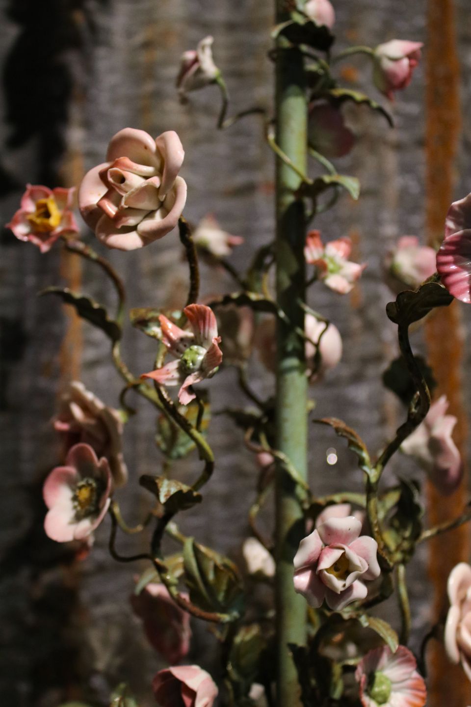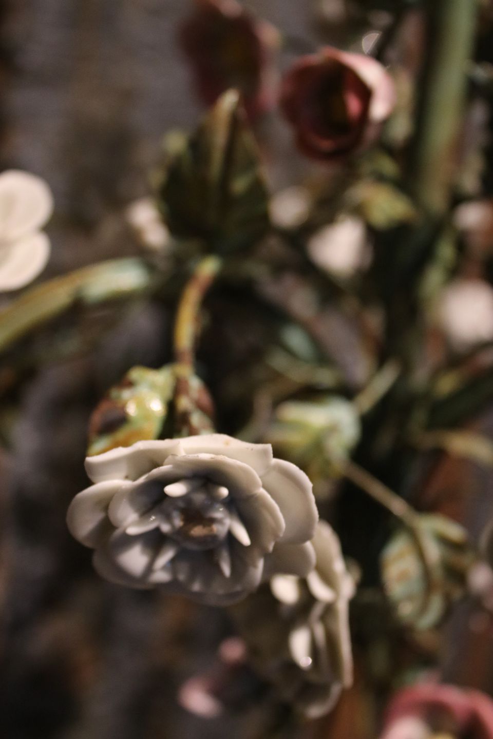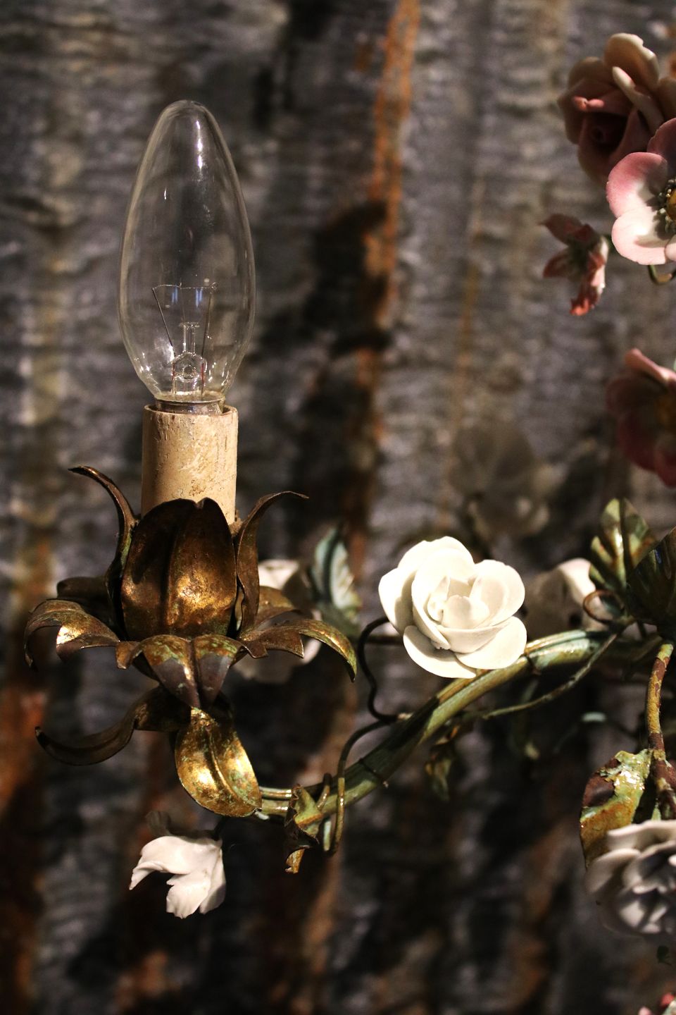 Old French chandelier with a base in green painted metal frame decorated with a lot of small fine colored / white porcelain flowers.The chandelier has 3 light sources and measures H: 85cm. Dia.: 45cm. (Some flowers have some small edge chips)