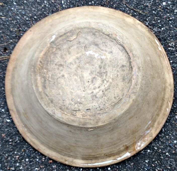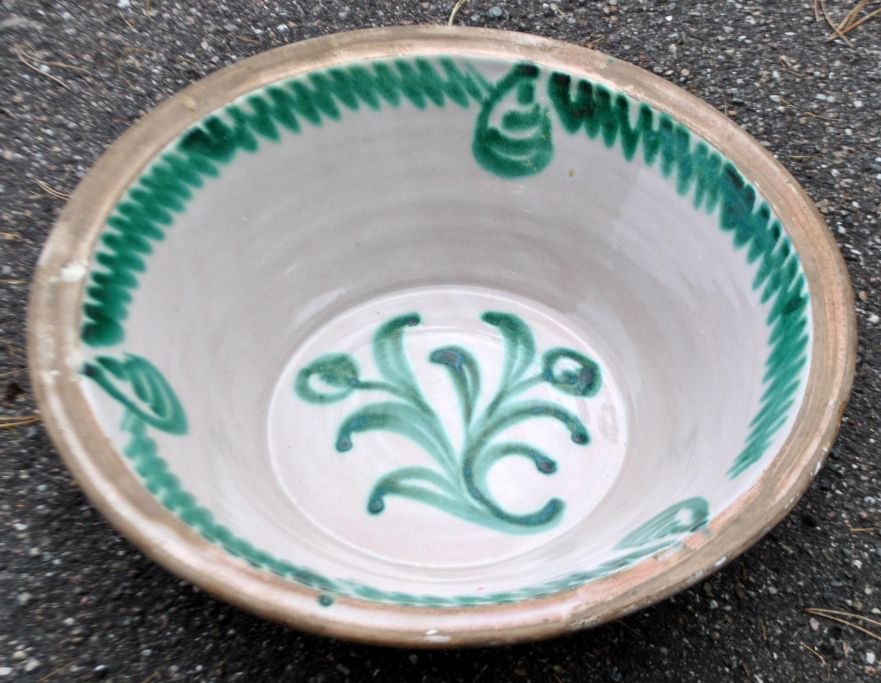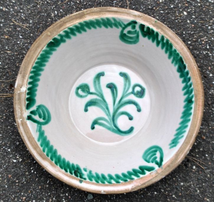 Large antique clay dish, 19th century. Inside with green and light glazes. With edge decoration and center decoration in the shape of a flower. Dia.: 42 cm. H.: 12 cm.Perfect condition!