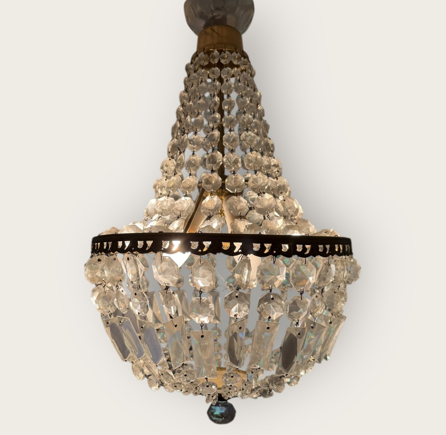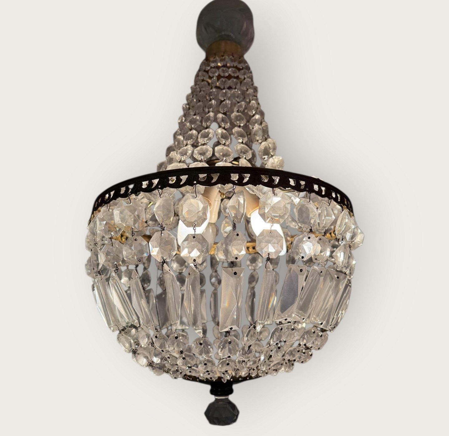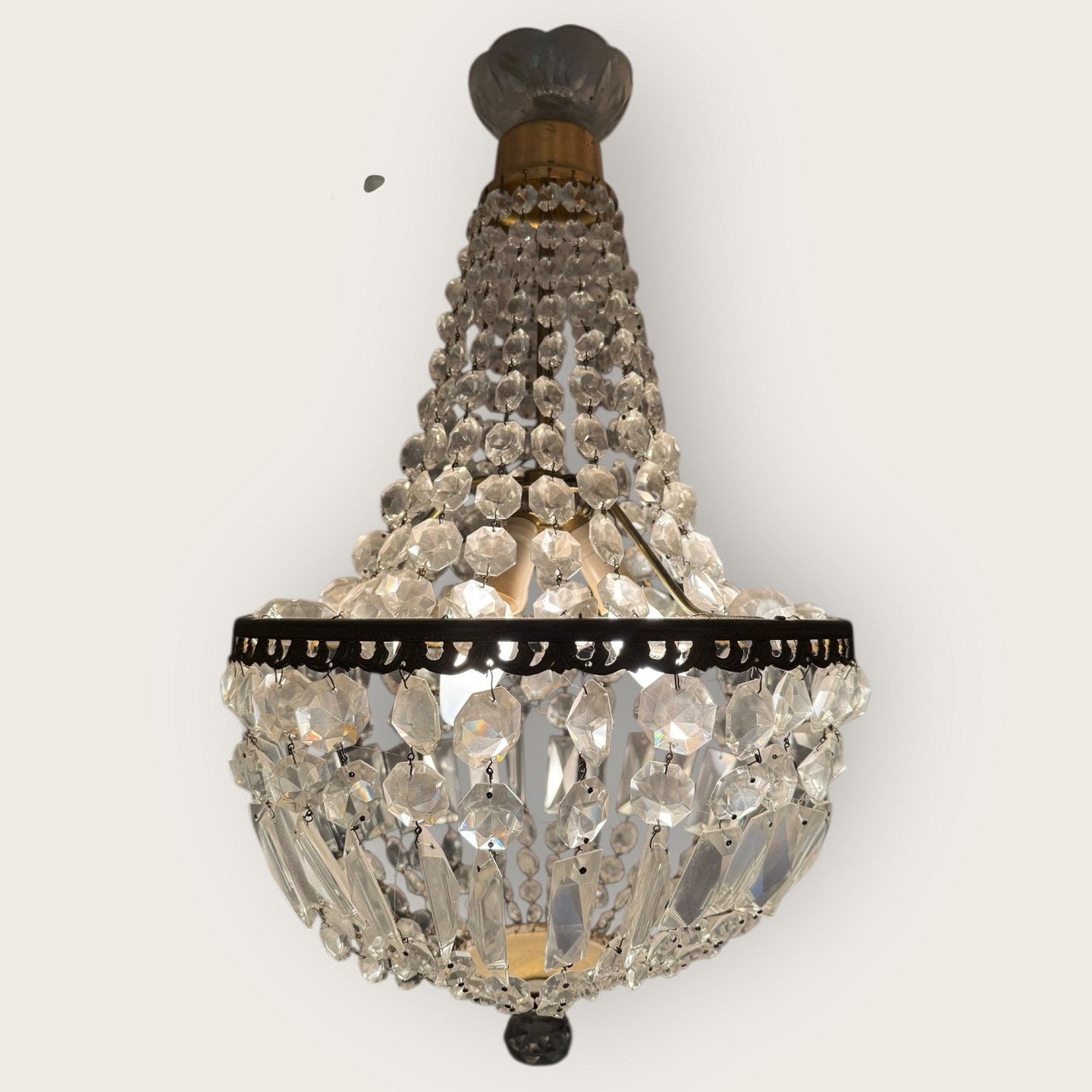 Chandelier with glass prisms, works fine and all prisms are there and in good condition.Stock: 1