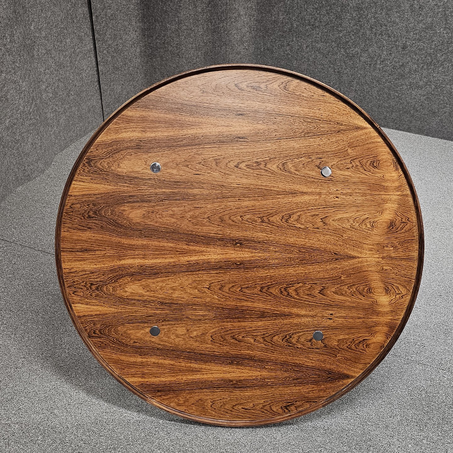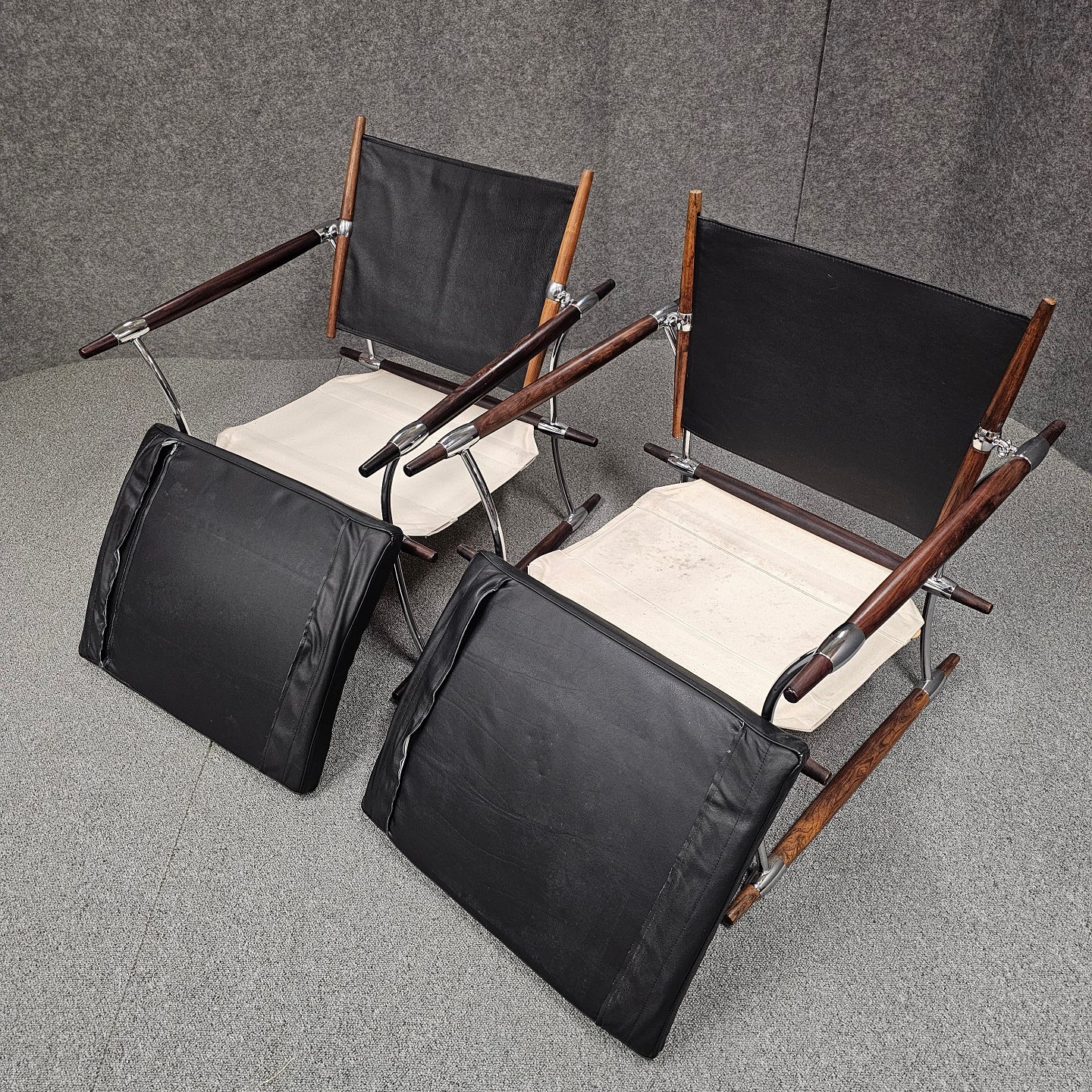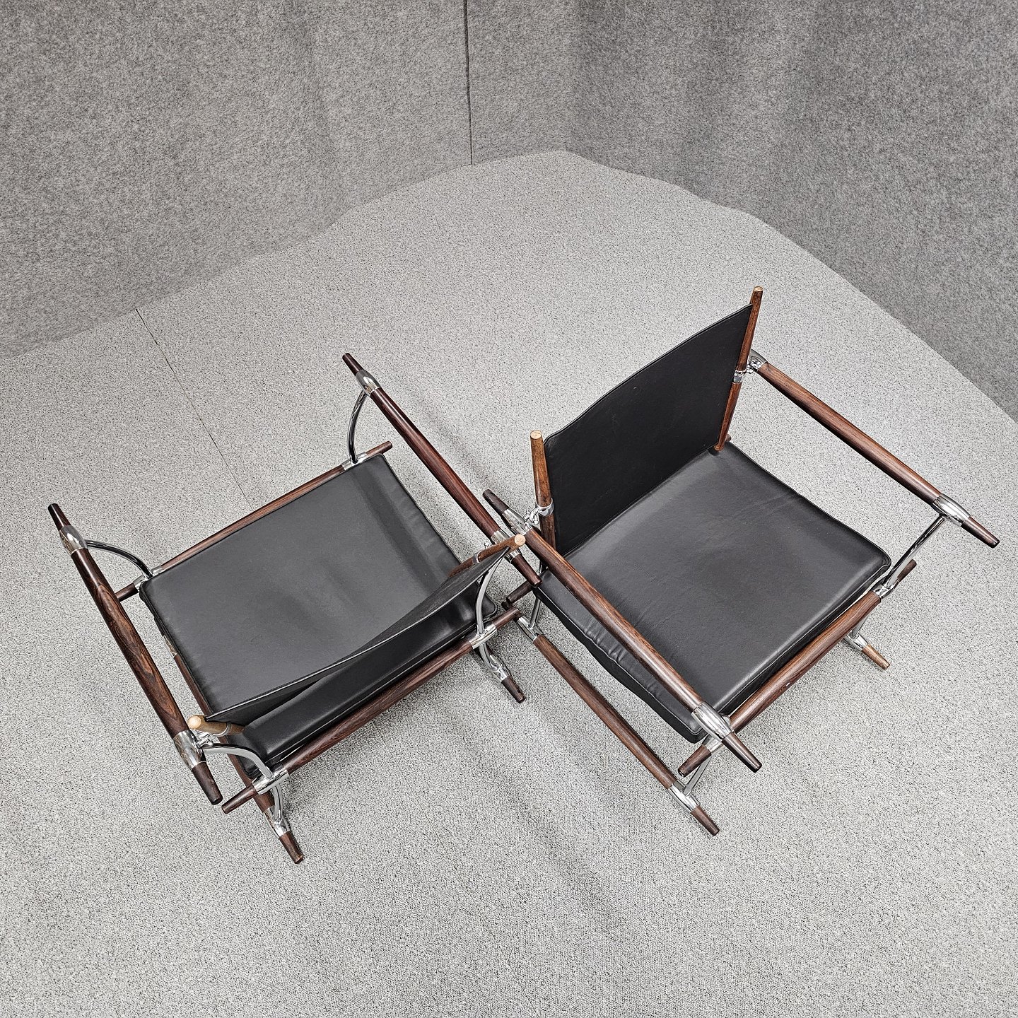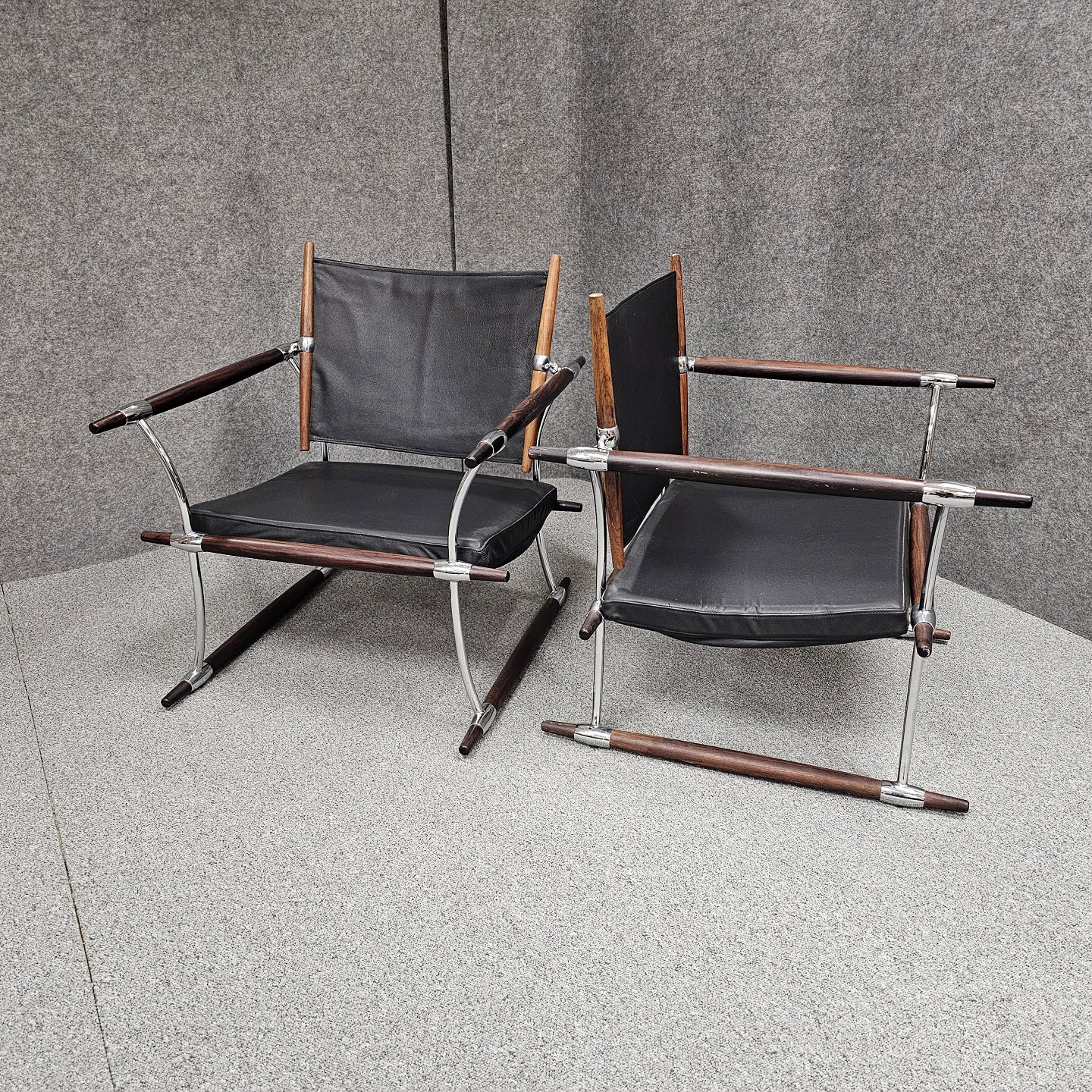 Sæt af to stokkestole med stel i palisander og forkromet stål og sæde af sort læder.Stokkebord ligeledes med stel i palisander og forkromet stål og med bordplade af palisander.