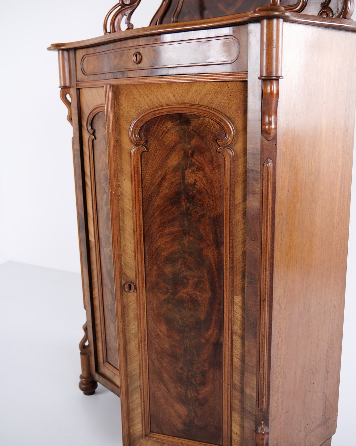 Antikt skab fra 1880’erne, udført i mahogni med dekorative udskæringer. Skabet har låger og indvendige hylder, velegnet til opbevaring i stue, entré eller spisestue.— Oprindelse: Europa