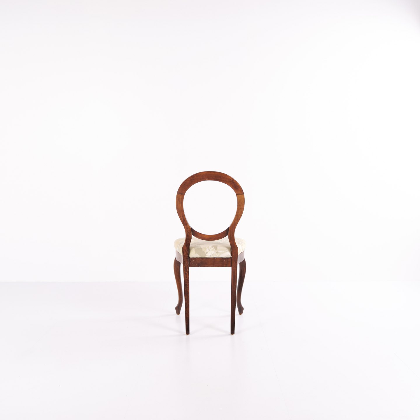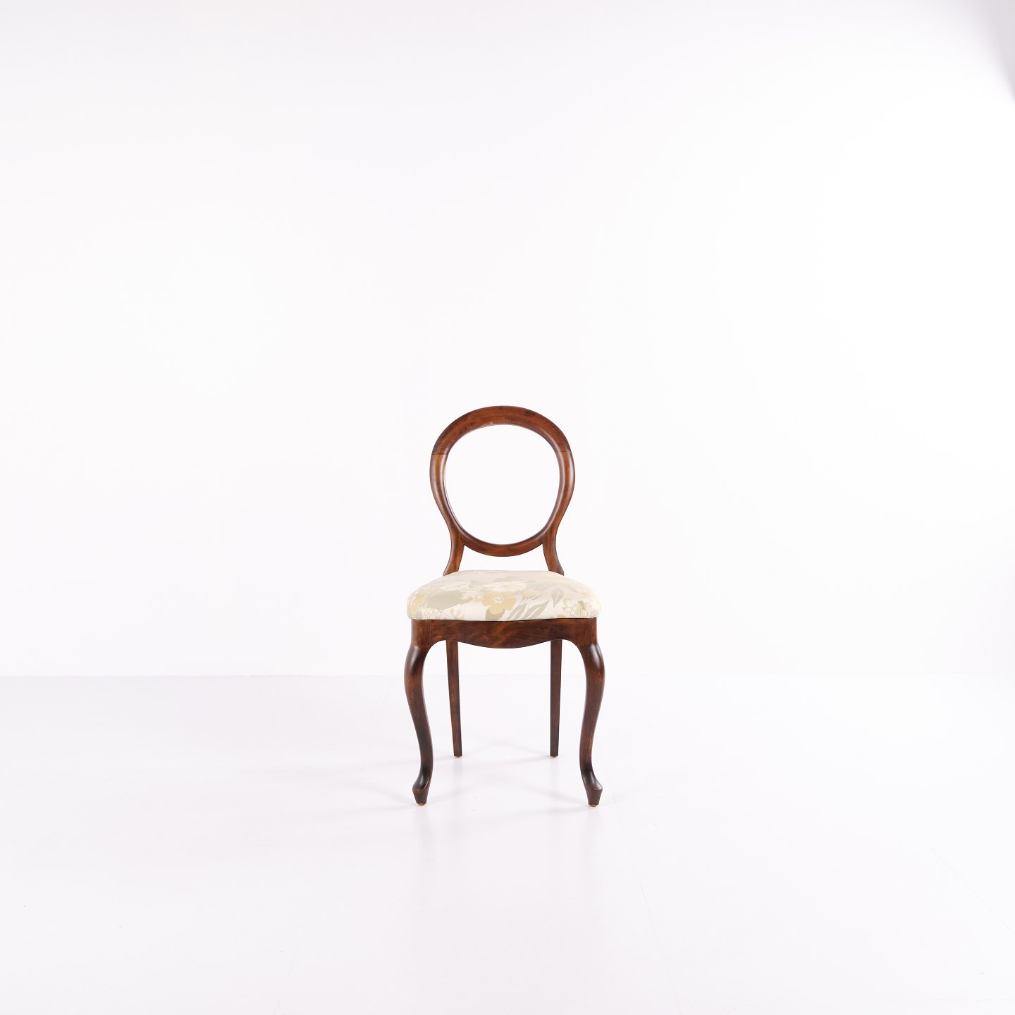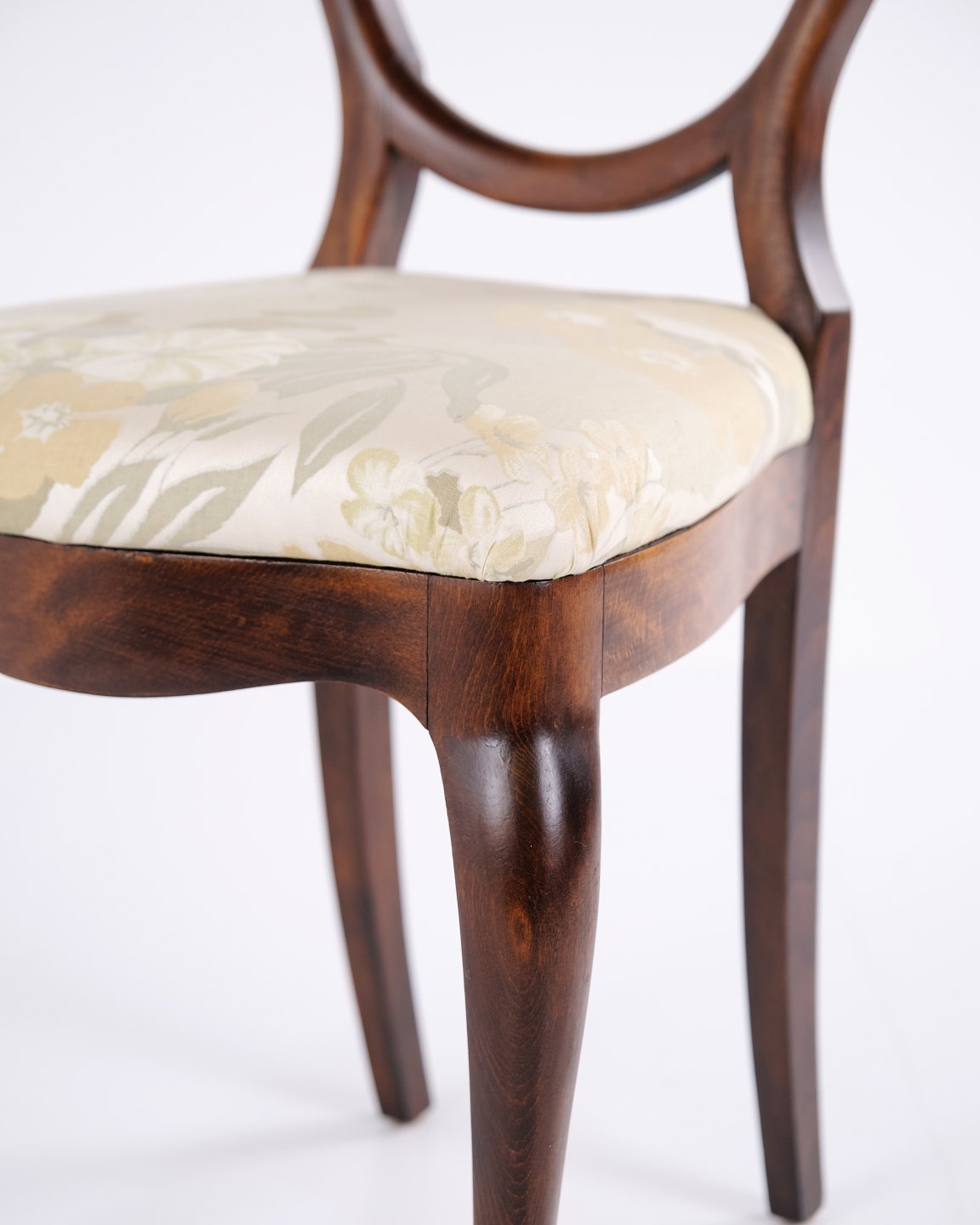 Set of four salon/dining chairs from the 1860s, made of mahogany and upholstered in light floral fabric. Rococo-inspired design with carved details and classic proportions. Elegant chairs for dining rooms, living spaces or hallways.— Origin: Europe