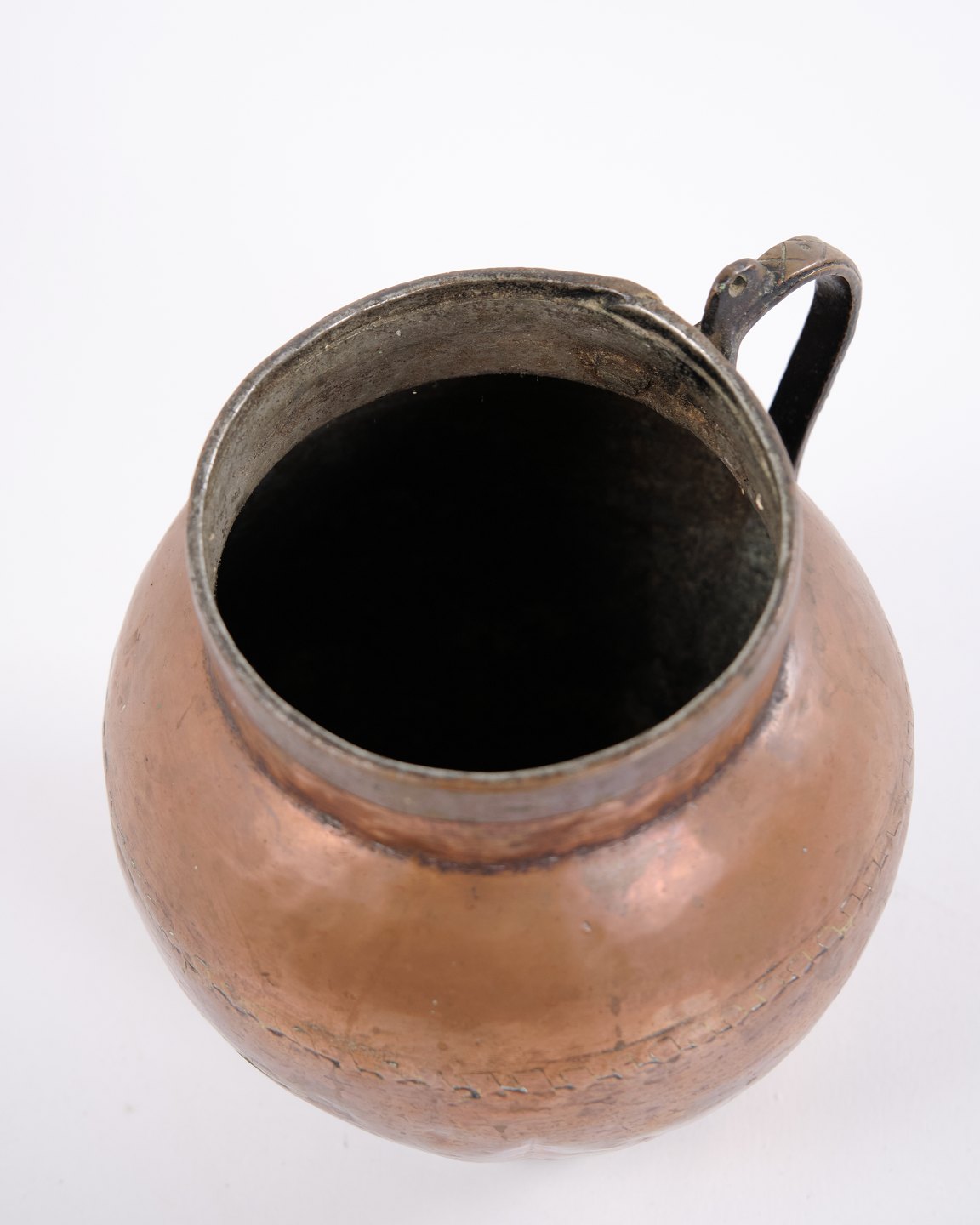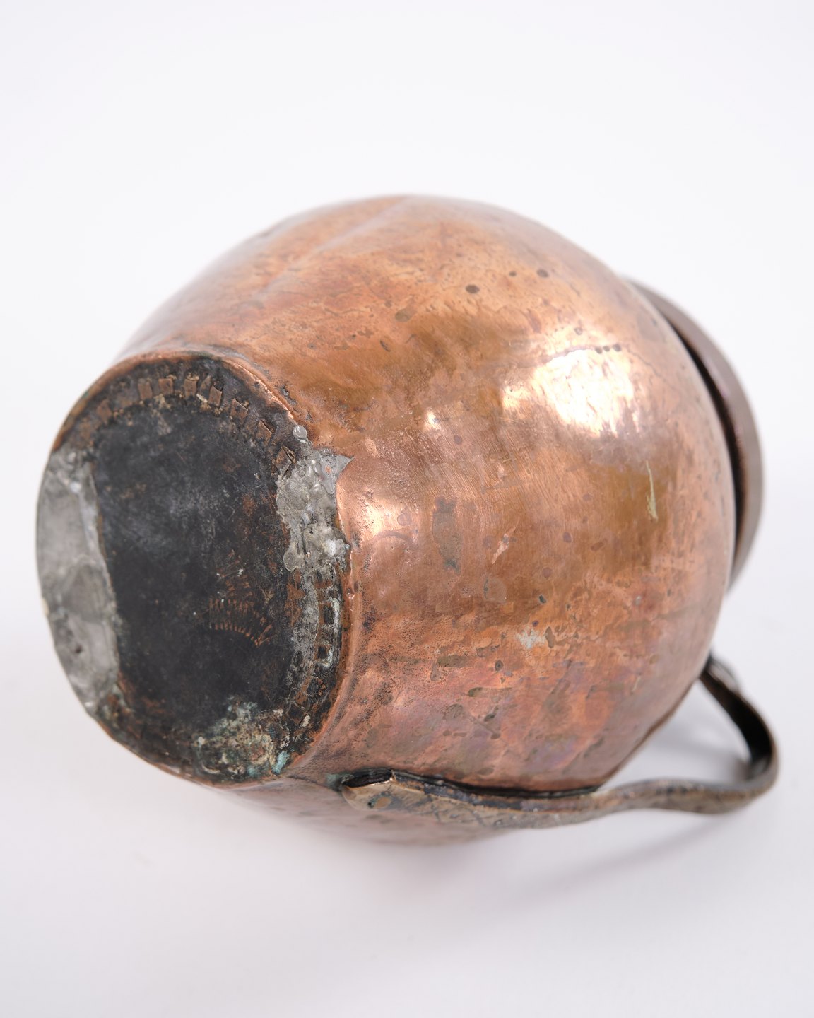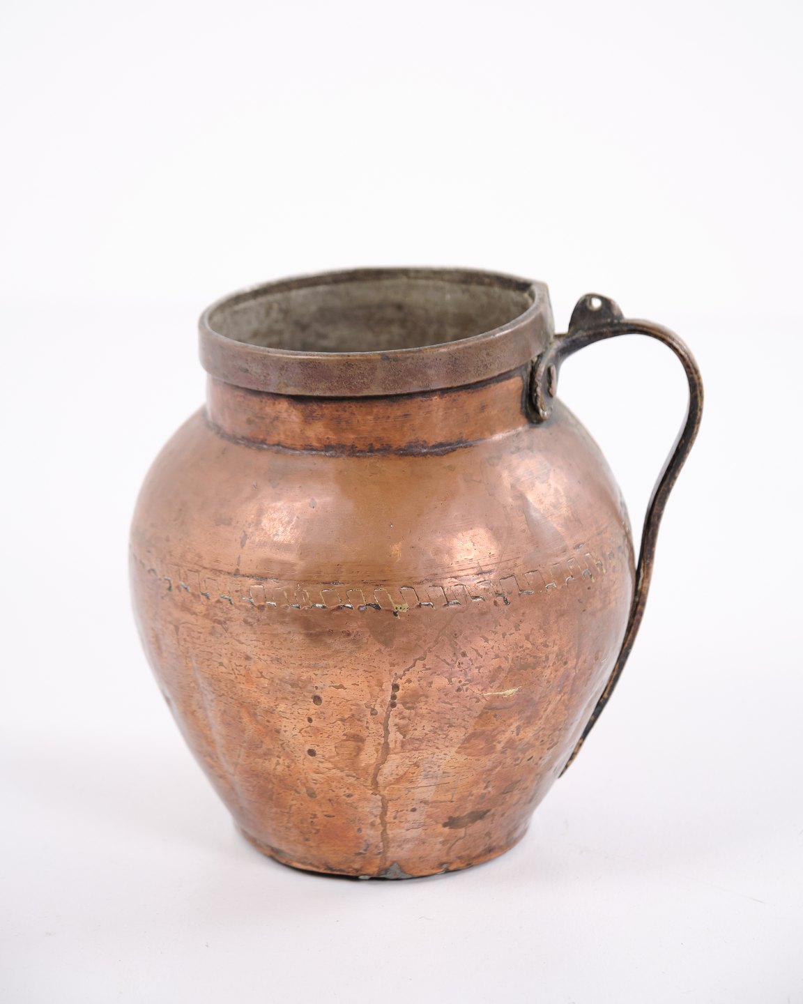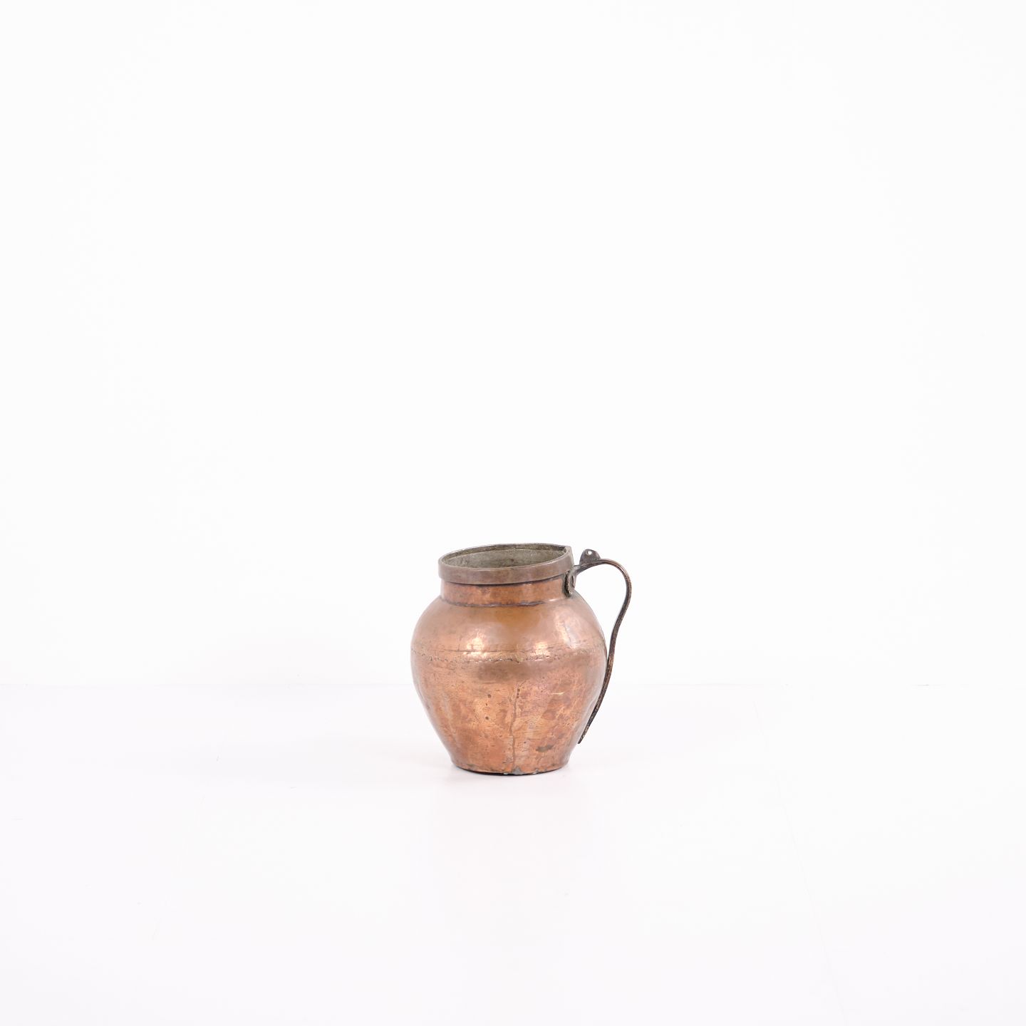 Handmade copper pitcher from the 19th century with sturdy handle and classic shape. Danish origin. Suitable as antique decoration, collectible, or functional use.— Origin: Denmark