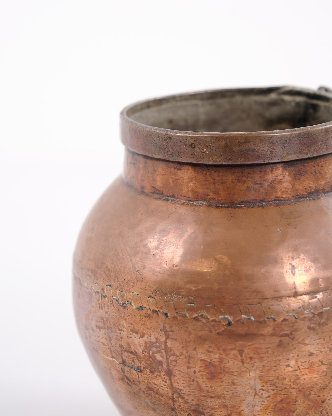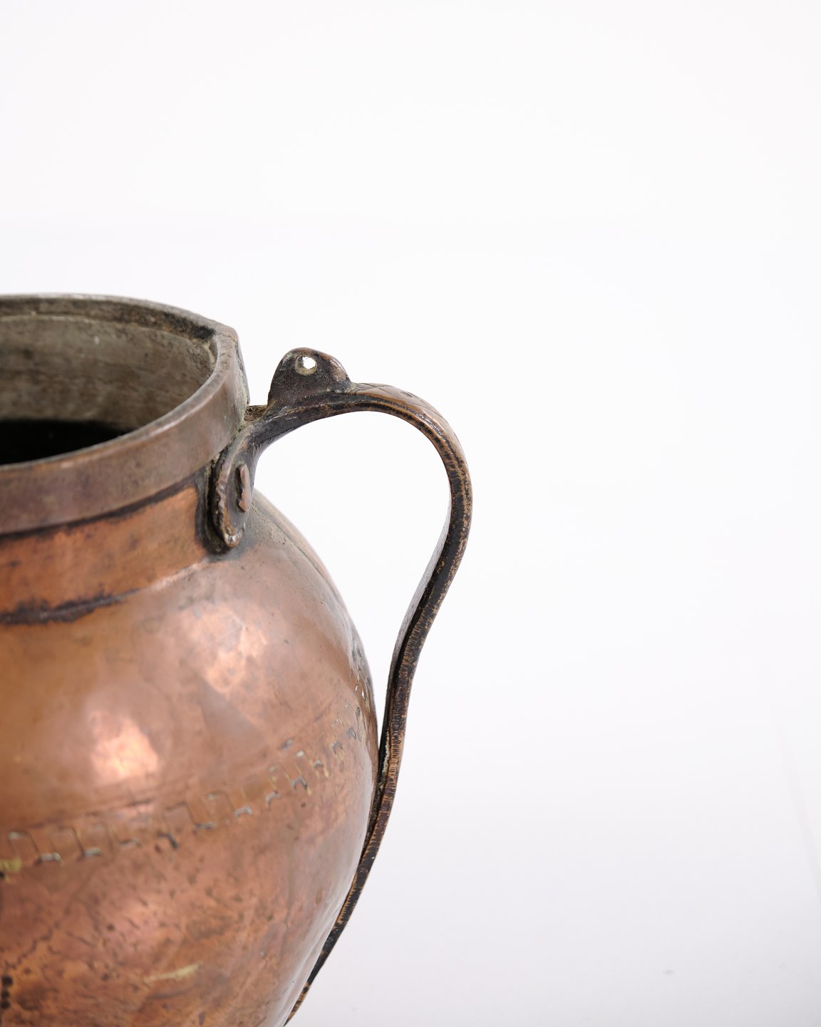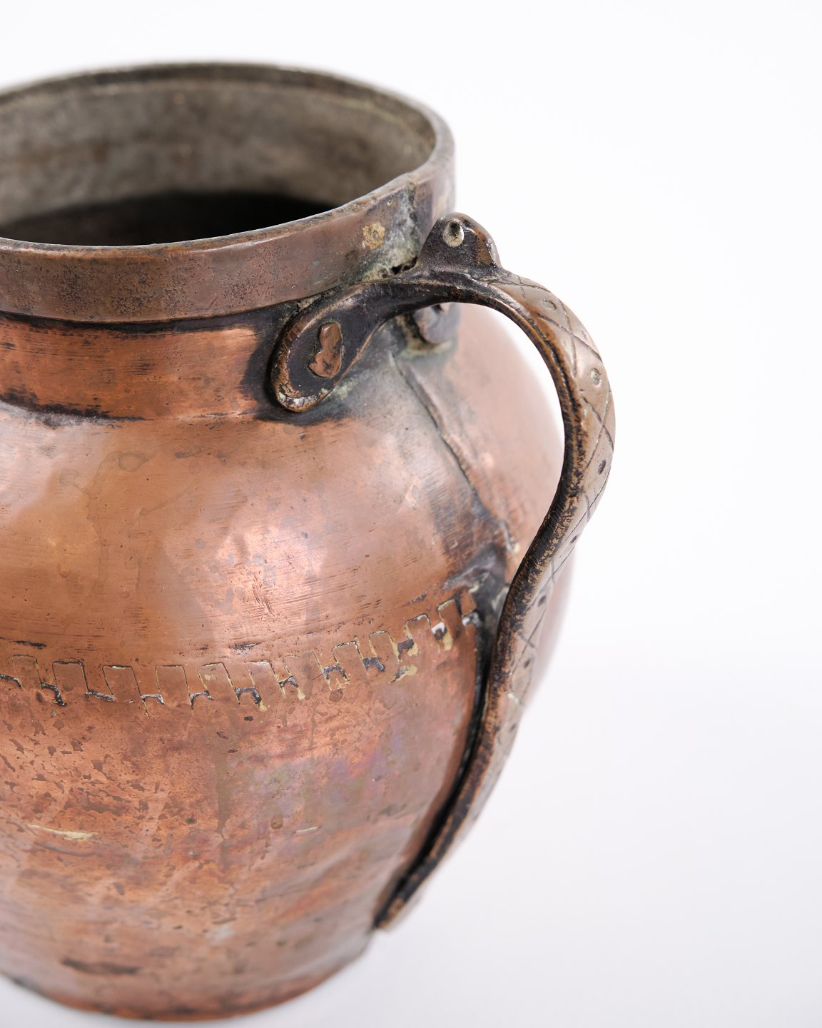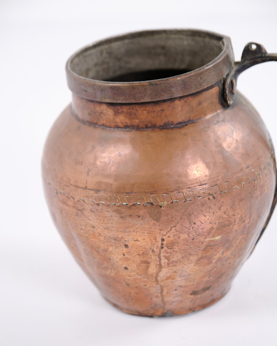 Handmade copper pitcher from the 19th century with sturdy handle and classic shape. Danish origin. Suitable as antique decoration, collectible, or functional use.— Origin: Denmark