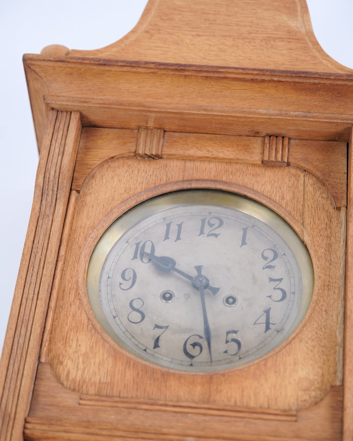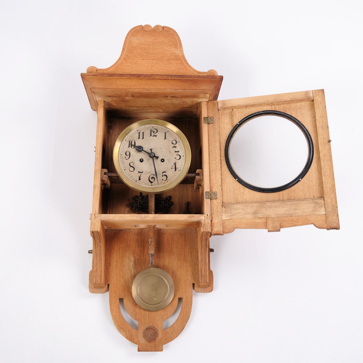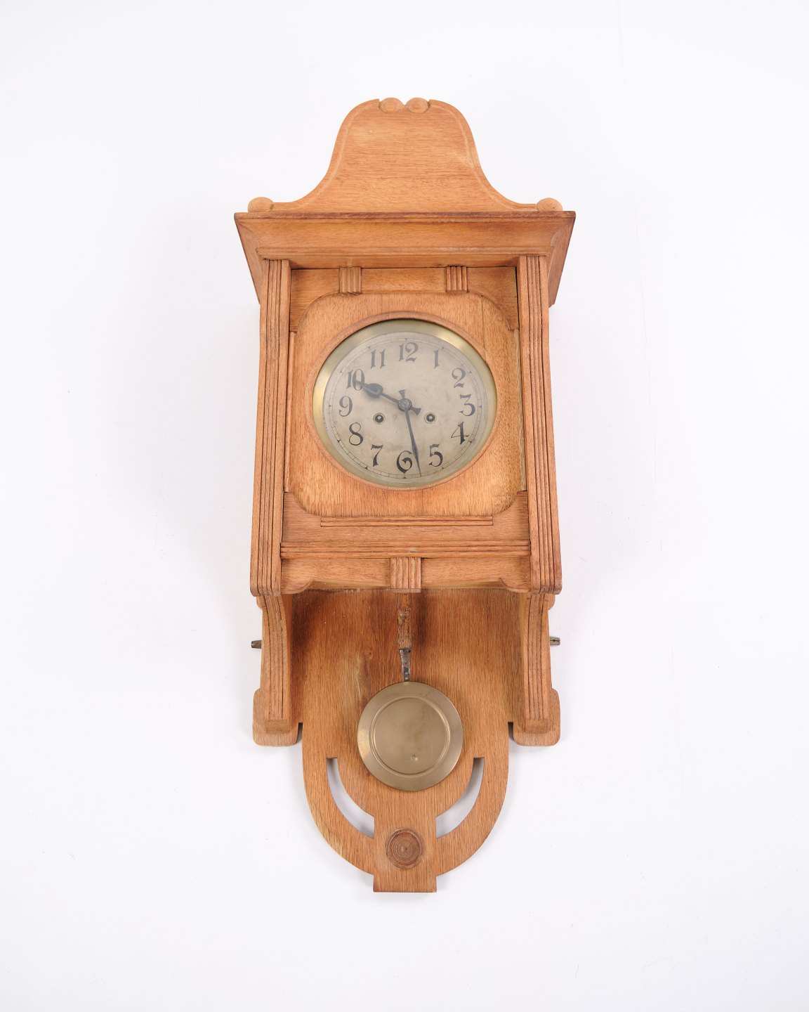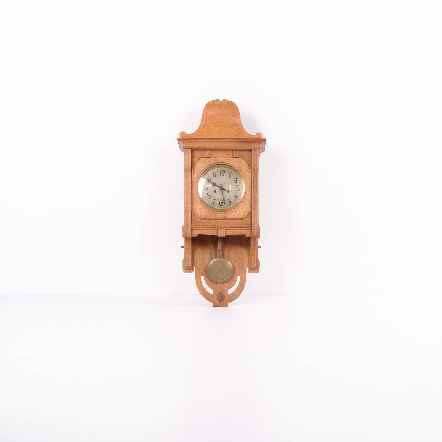 Wall clock from the early 1930s, crafted in oak and designed in the characteristic organic style of Art Nouveau. The case features elegant detailing and a classic front that reflects the craftsmanship of the period.— Origin: Germany