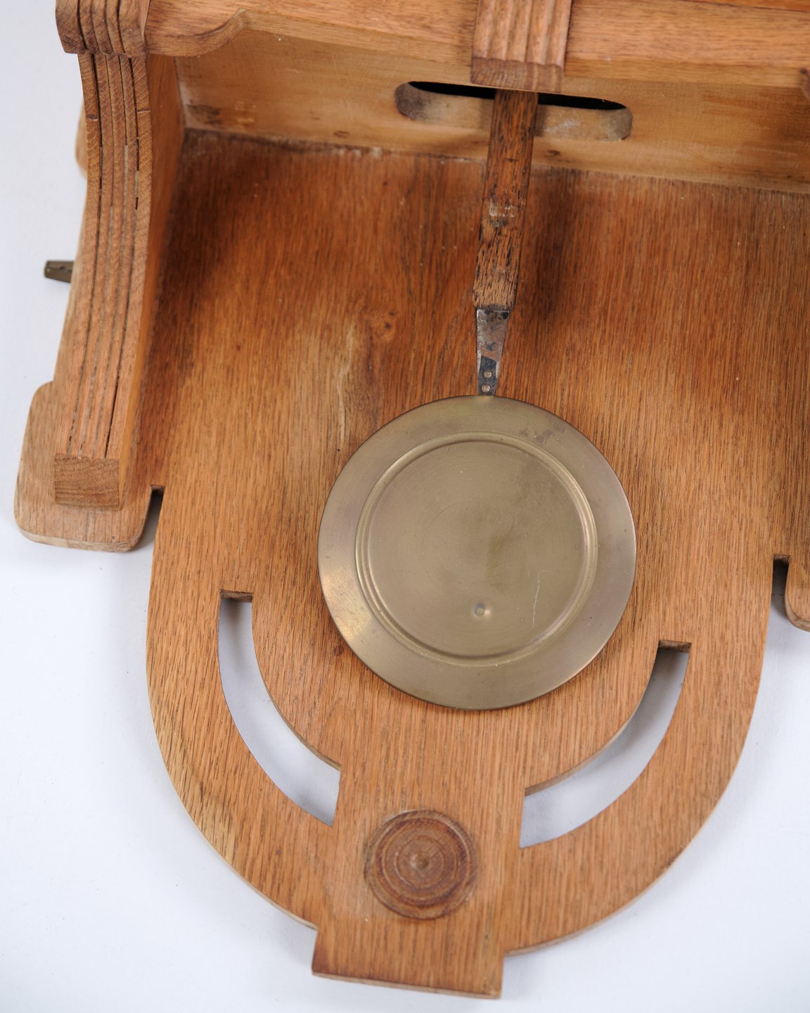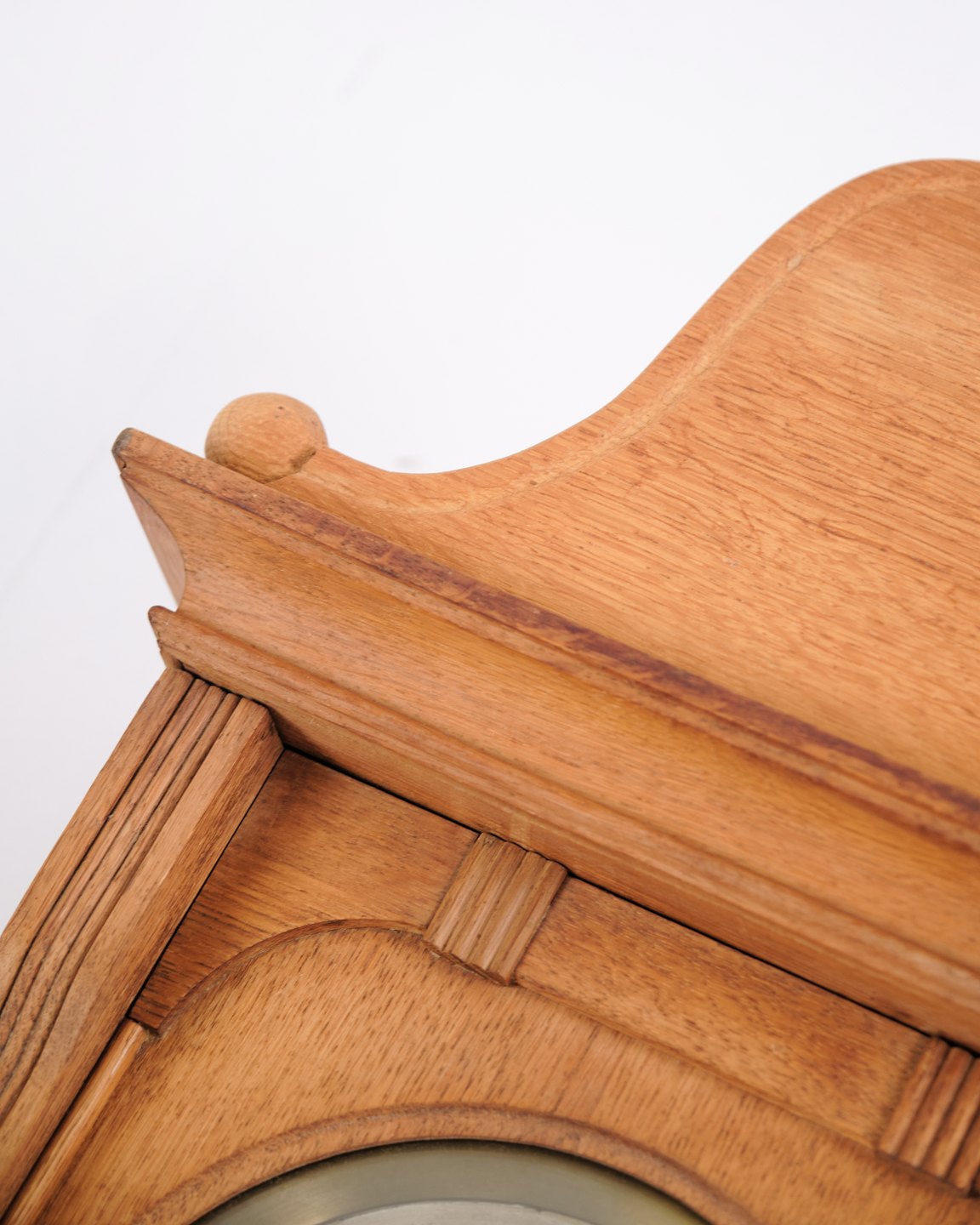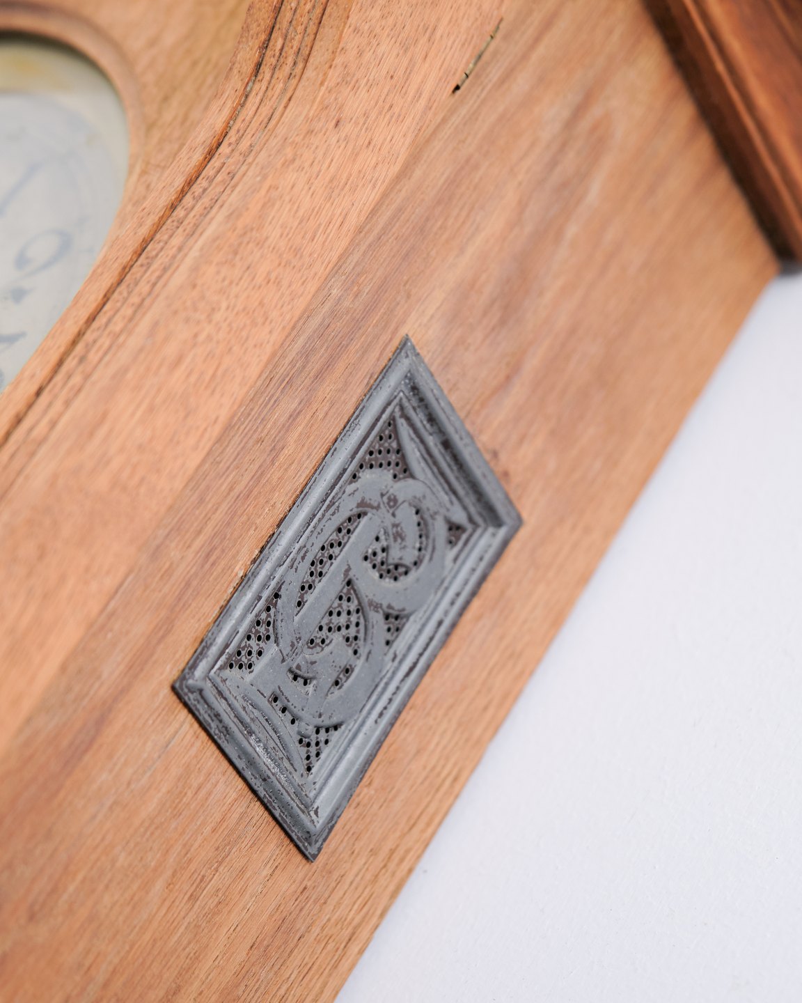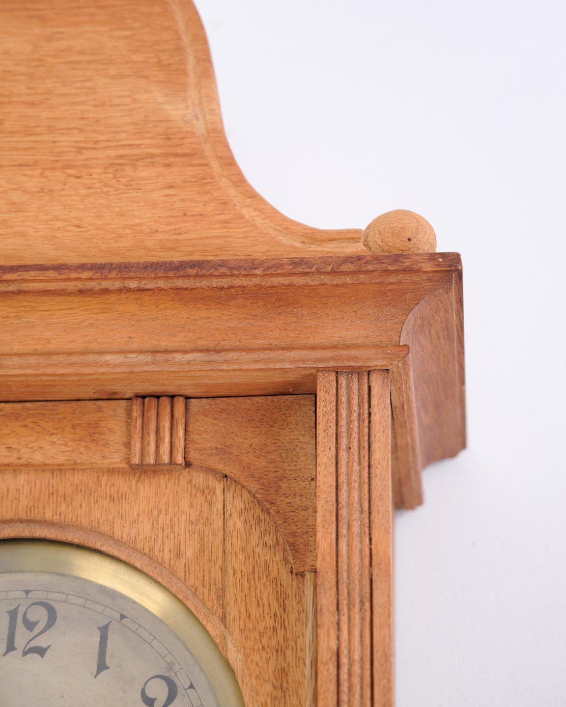 Wall clock from the early 1930s, crafted in oak and designed in the characteristic organic style of Art Nouveau. The case features elegant detailing and a classic front that reflects the craftsmanship of the period.— Origin: Germany