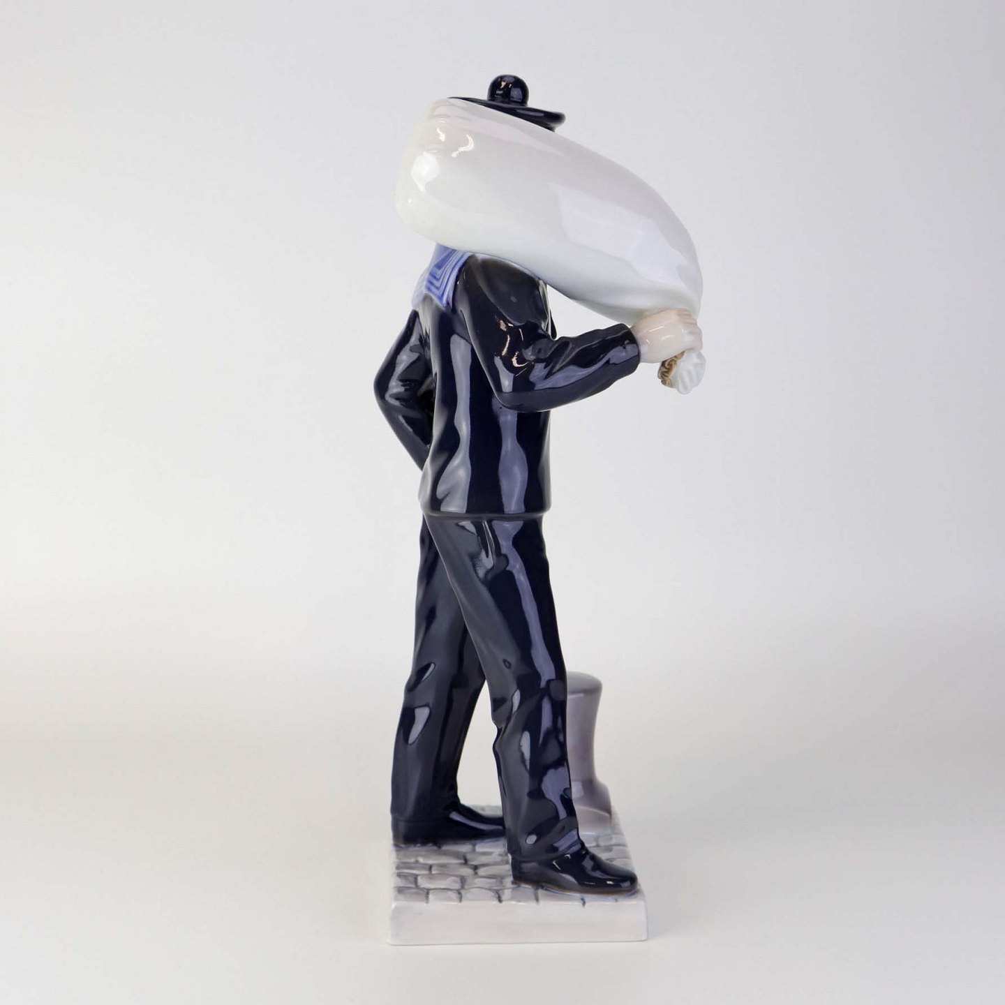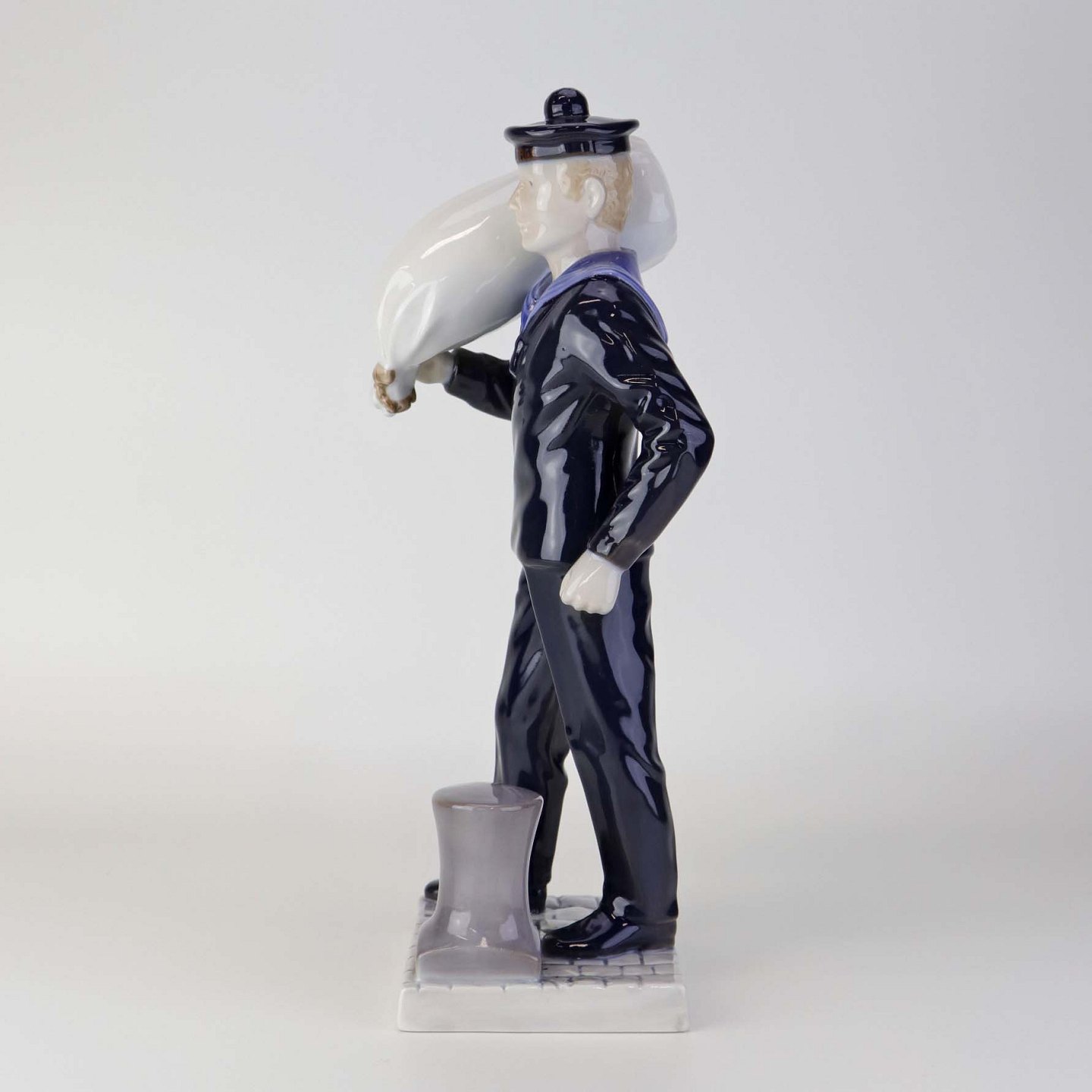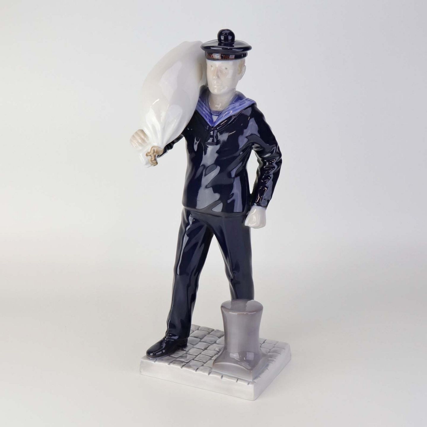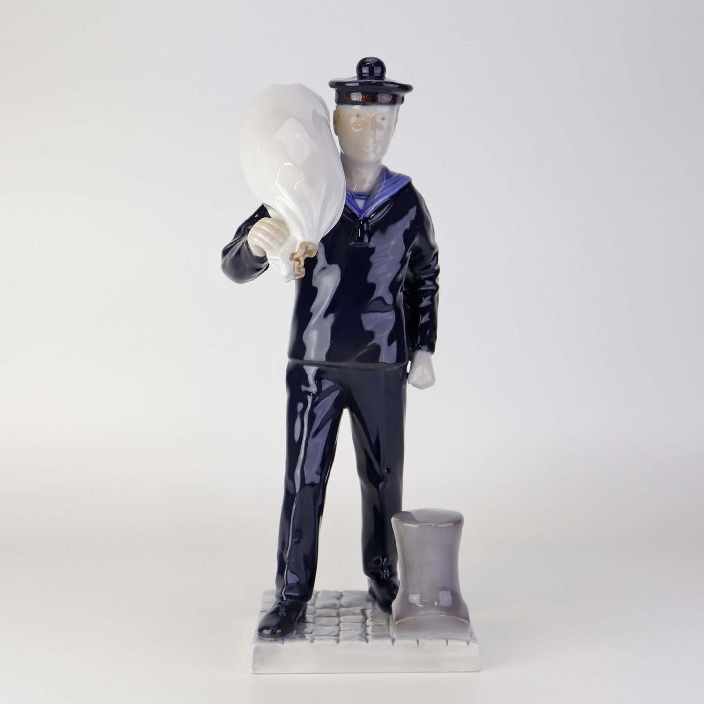 Figur i porcelæn med motiv af Matros med vadsæk fra skibet George Stage. Nr. 2456Producent Bing & Grøndahl