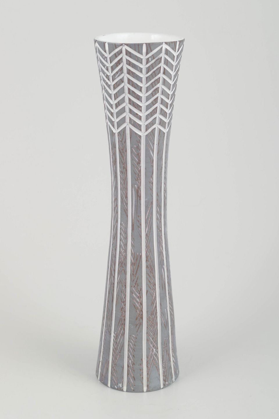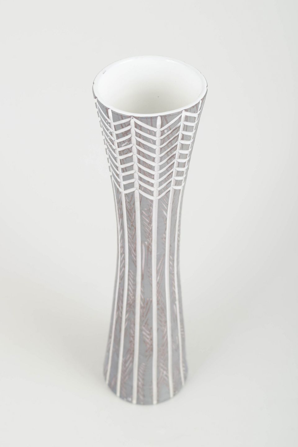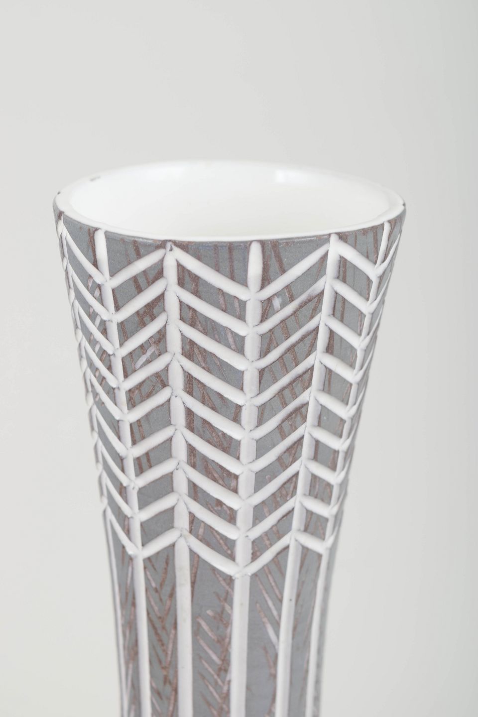 Tall, slender ceramic vase in glazed faience with characteristic geometric decoration in grey and white tones, typical of Simmulson’s refined and modern expression.