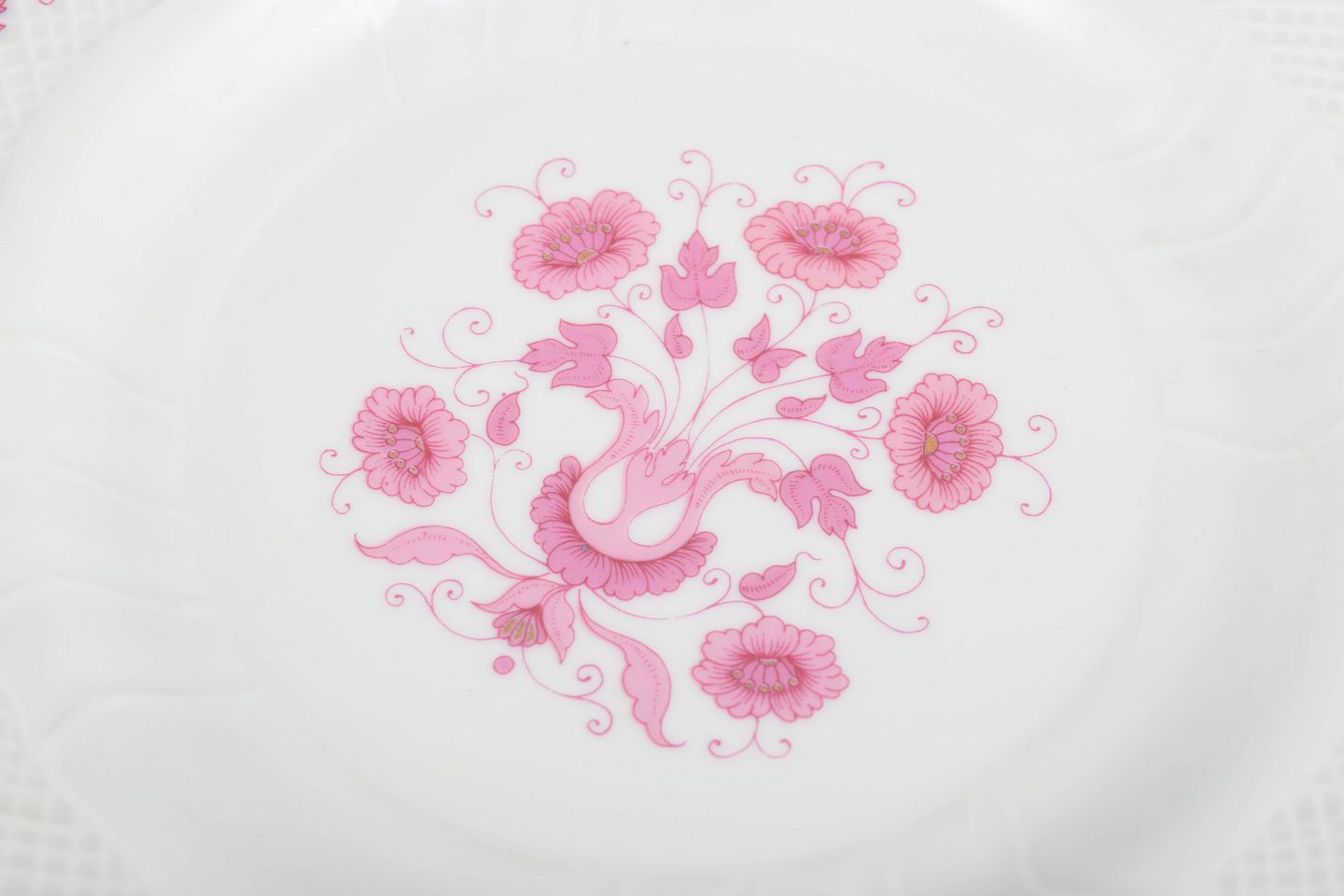 Set of six elegant porcelain salad plates with pink floral decoration and gilded rim, produced by the renowned Hungarian porcelain manufacturer Hollóháza.