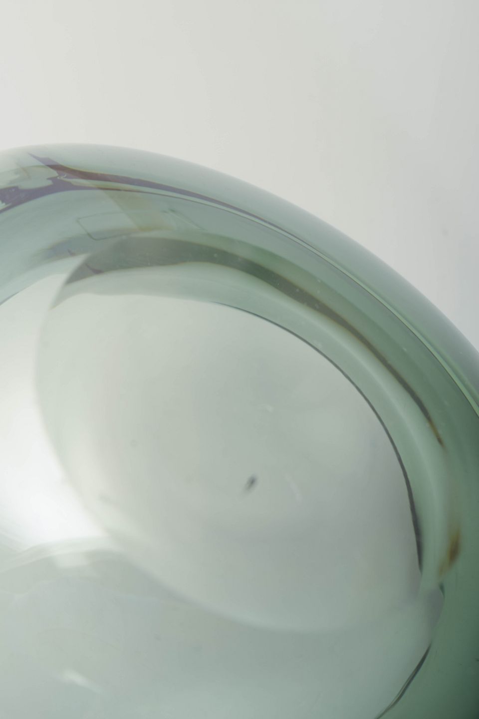 Organically shaped mouth-blown bowl in green glass with thick walls and soft, rounded contours, typical of Scandinavian glass design of the period.