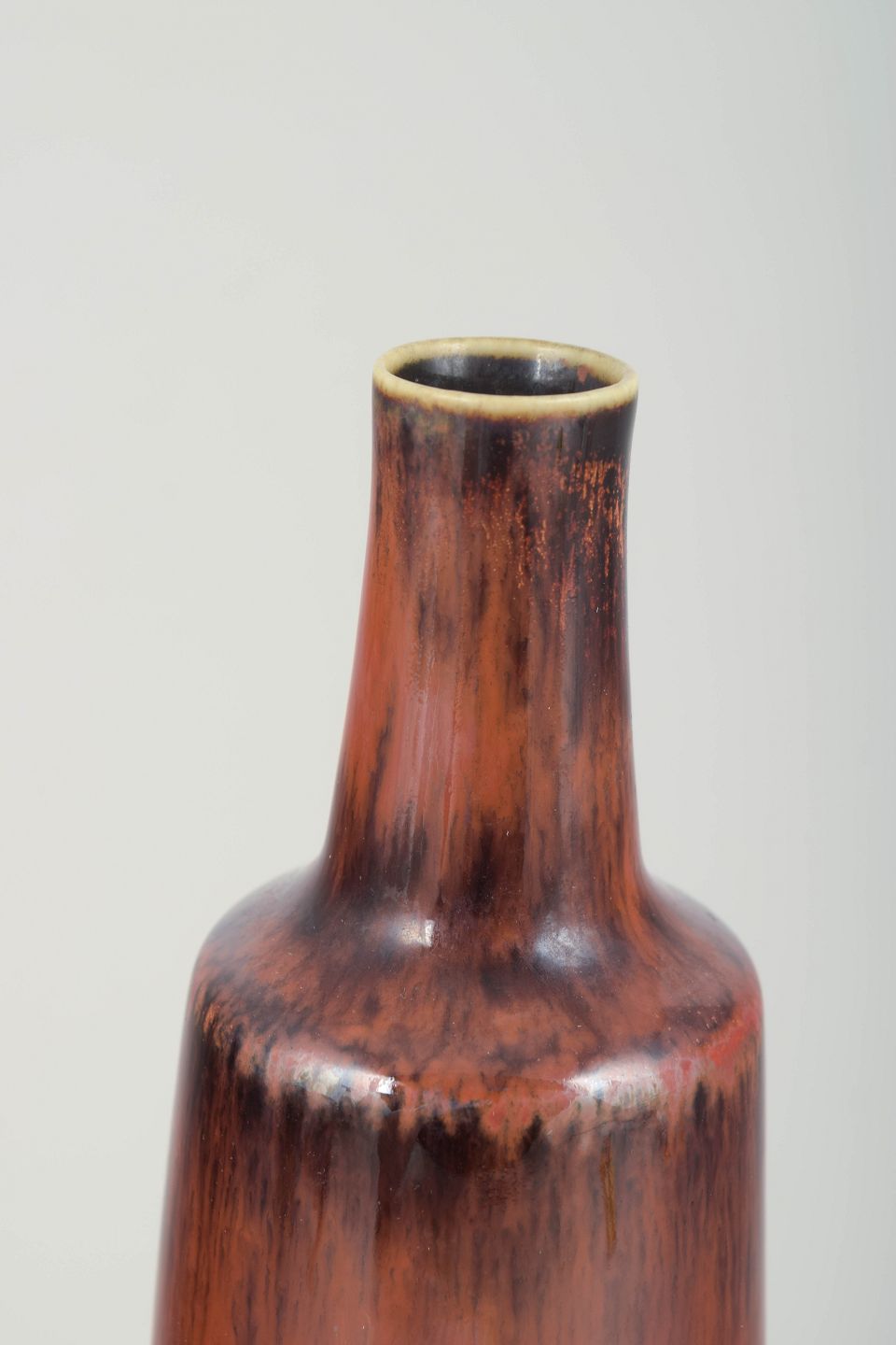 Elegant cylindrical stoneware vase with a narrow neck and characteristic reddish-brown glaze with darker running tones towards the base – a fine example of Stålhane’s refined form language and glaze work.