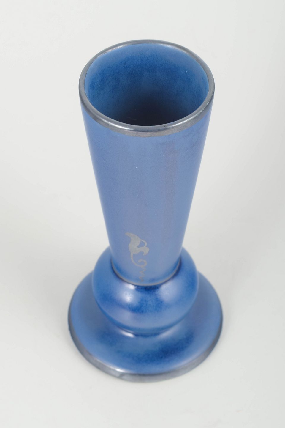 Tall decorative vase in intense blue glaze with a metallic sheen and stylised decorative motif. Sculptural form featuring a pronounced rounded base and tapered body.