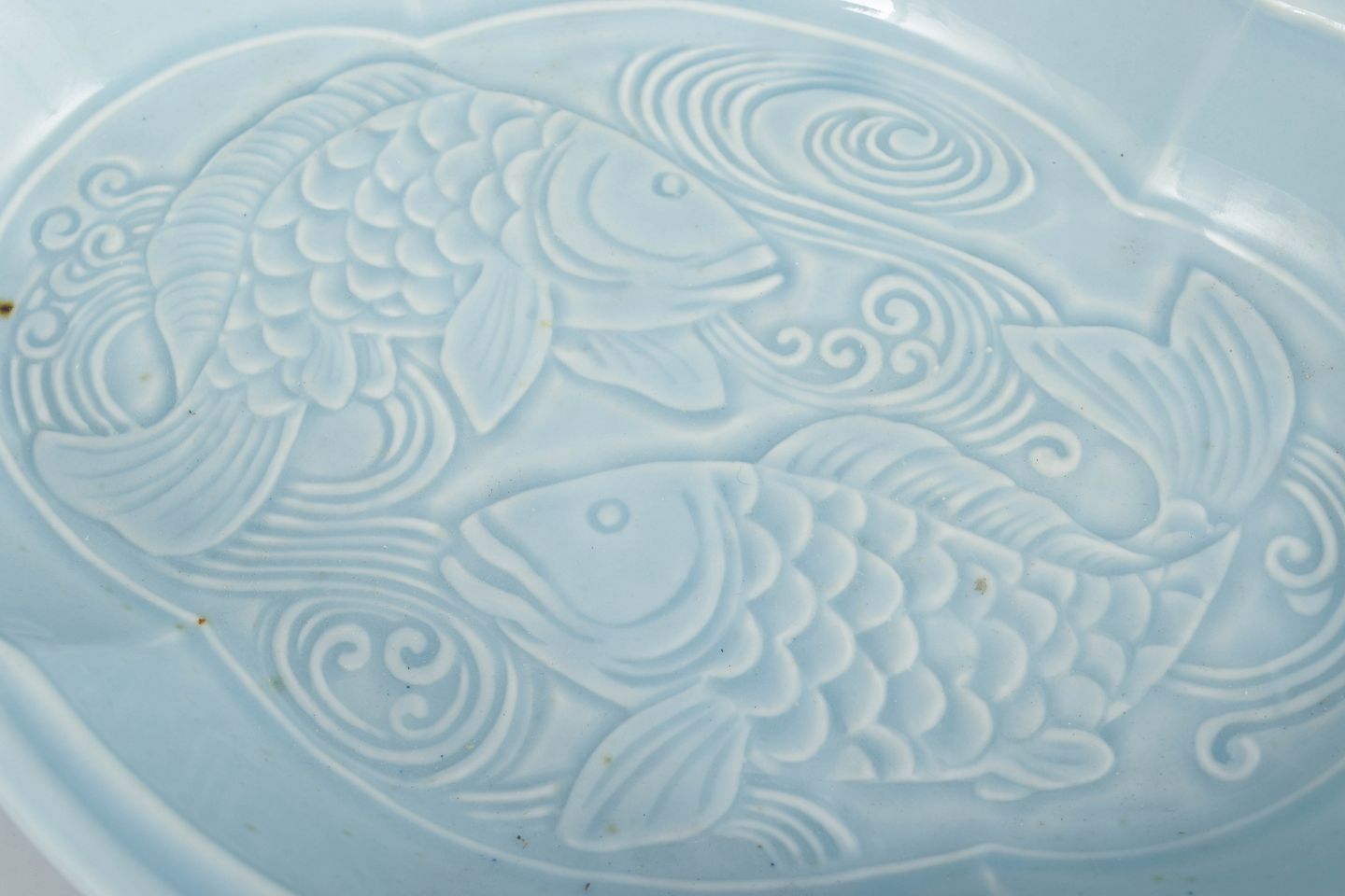 Unique dish in Chinese-inspired style with moulded fish decoration and a light celadon-style blue glaze. Signed.