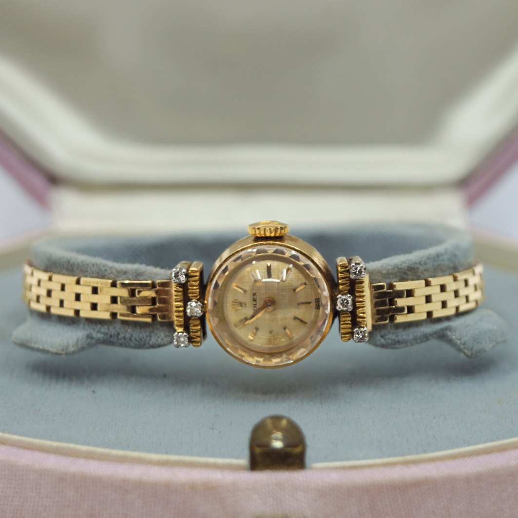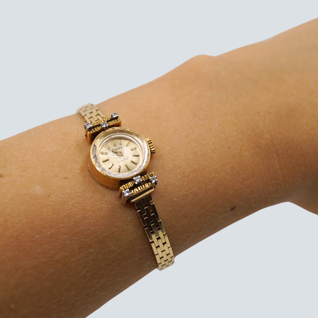 Rolex wristwatch.Rolex; Orchid watch in 18k gold, with six diamonds set in white gold. Ref. 988531. Wristchain in 14k gold. Clasp with 2 safety cathes.