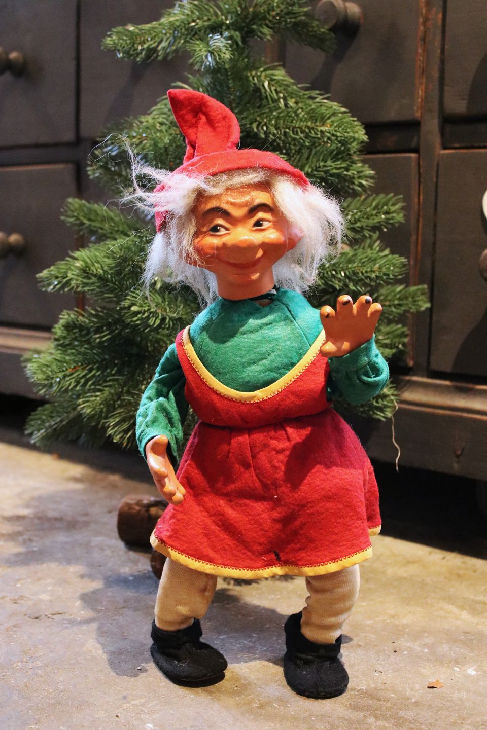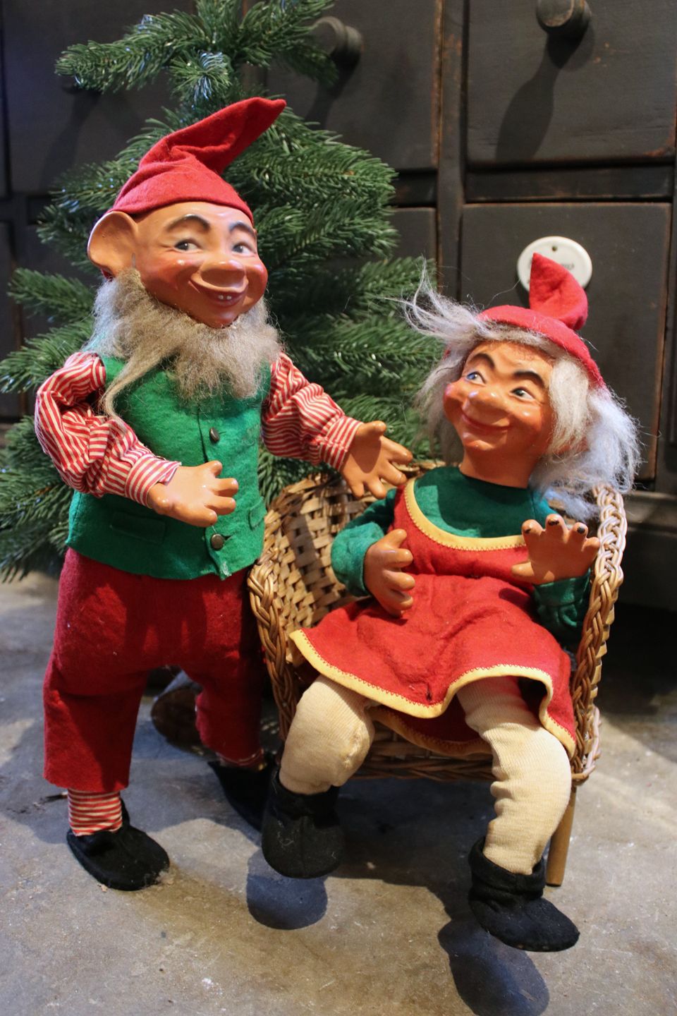 2 old shop elves with felt clothes and faces in painted papier-mâché. (Mother and Father) Height: 40cm. Sold individually!Item number: Nisse mor & far