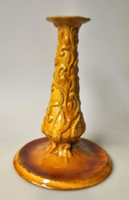 Hammershøj, Svend (1873 - 1948) Denmark: Candlestick. 1904 - 1908. Glazed earthenware. Yellow glazed. With ornamentation. Made by HA Kähler in Næstved. H.: 23 cm. Dia. foot: 16.5 cm.With minor burn cracks.