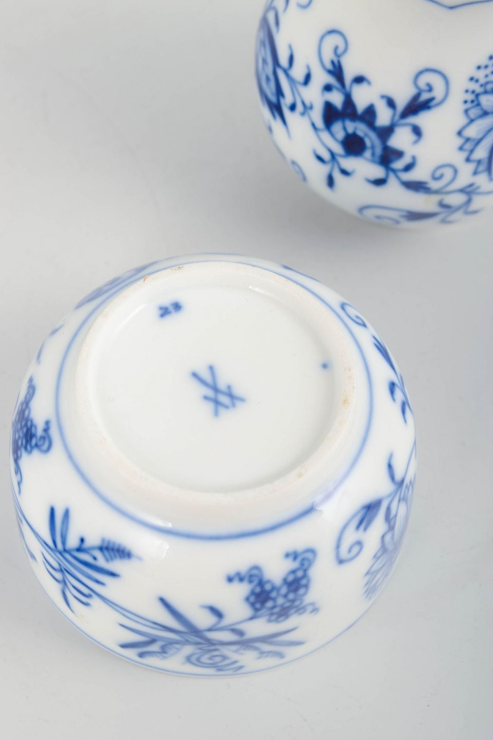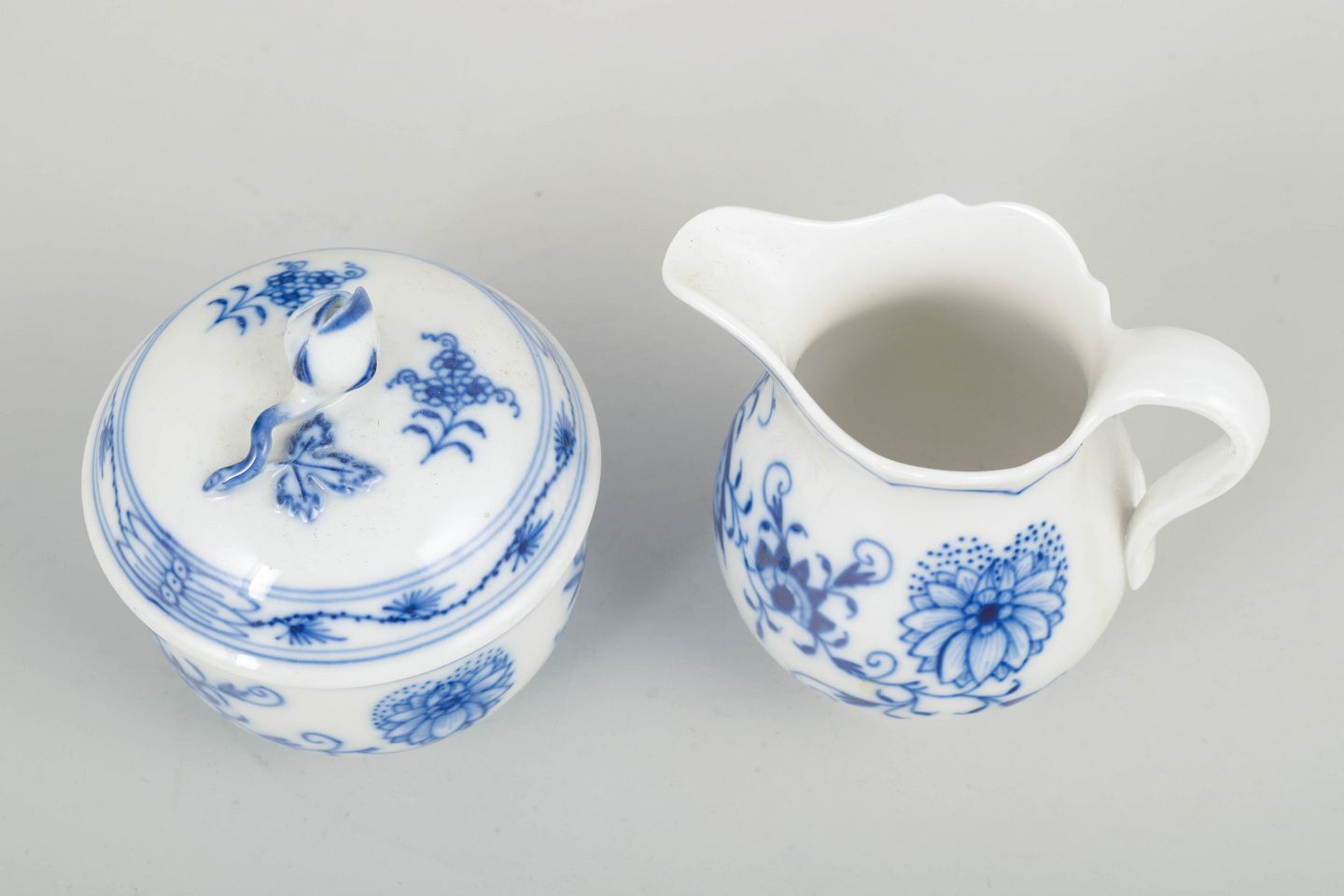 Meissen Blue Onion pattern sugar bowl and cream jug, mid-20th century.A charming set consisting of a classic lidded sugar bowl and a cream jug in the iconic Blue Onion pattern (Zwiebelmuster). Both pieces are hand-painted in cobalt blue underglaze and made in the elegant forms characteristic of Meissen’s early 20th-century production.