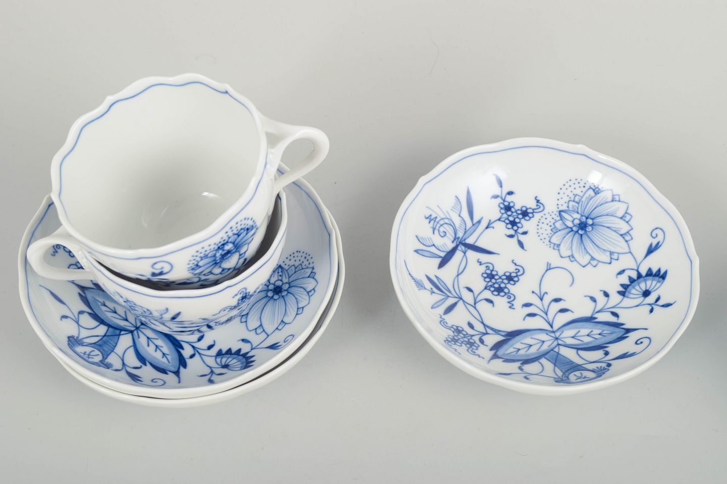 Meissen Blue Onion pattern – three coffee cups with matching saucers.Set of three Meissen coffee cups with matching saucers in the classic Blue Onion pattern (Zwiebelmuster).