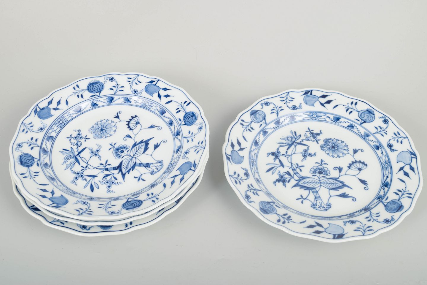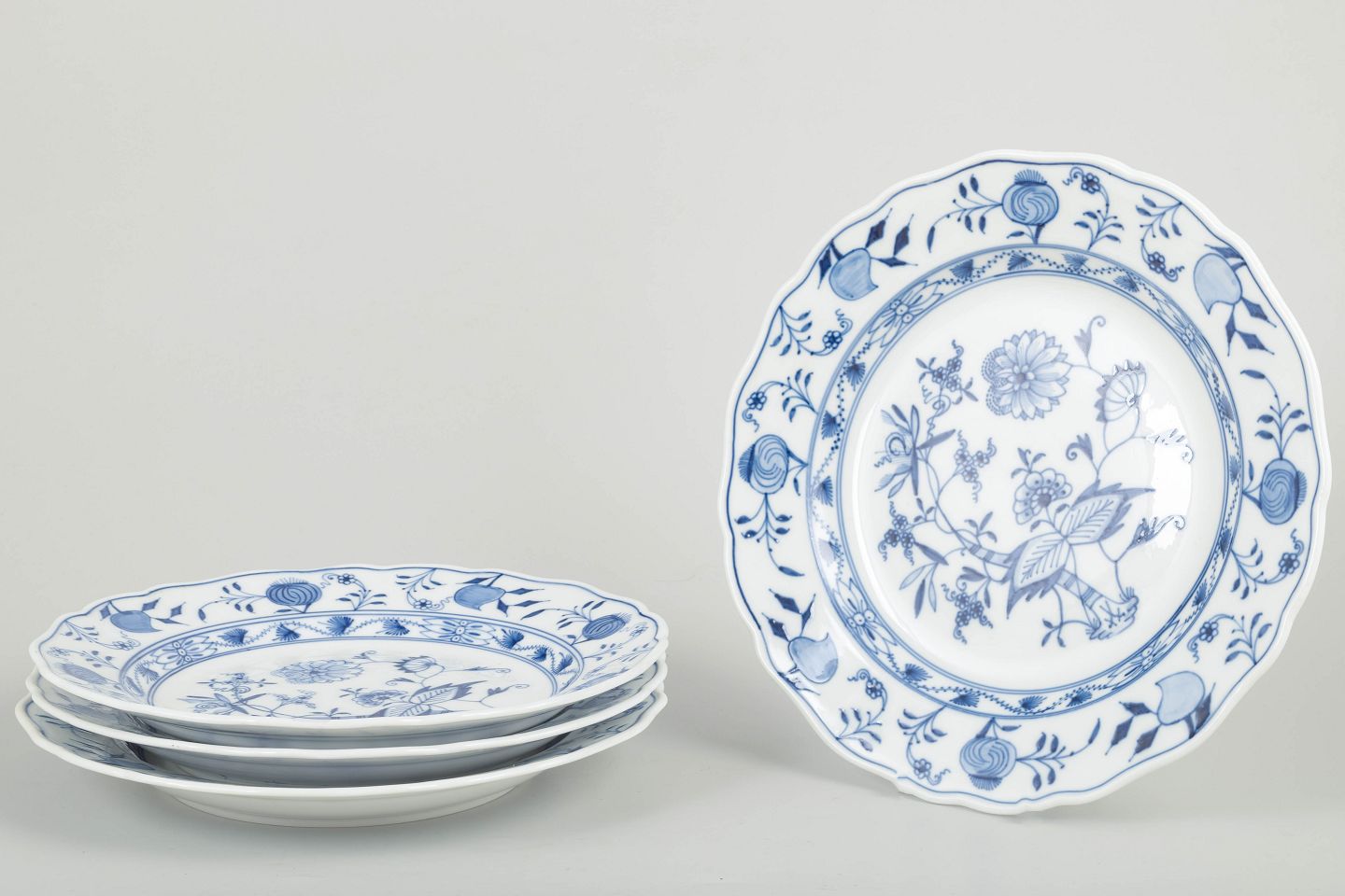 Four classic Meissen plates from the iconic Zwiebelmuster (Blue Onion) pattern with scalloped rim and hand-painted blue underglaze decoration. An early 20th-century set of fine quality.
