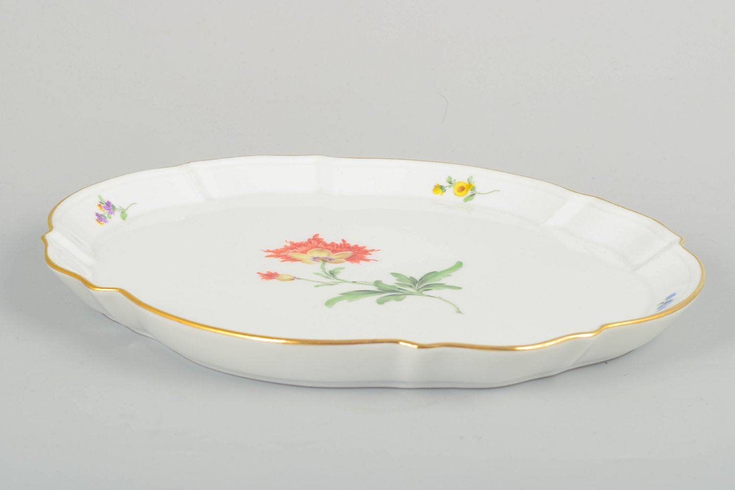 Oval Meissen porcelain tray with hand-painted polychrome floral decoration and fine gilt edging. Elegantly shaped with a softly scalloped rim.