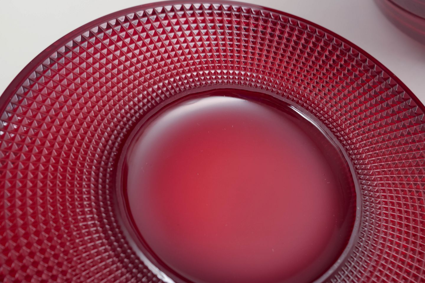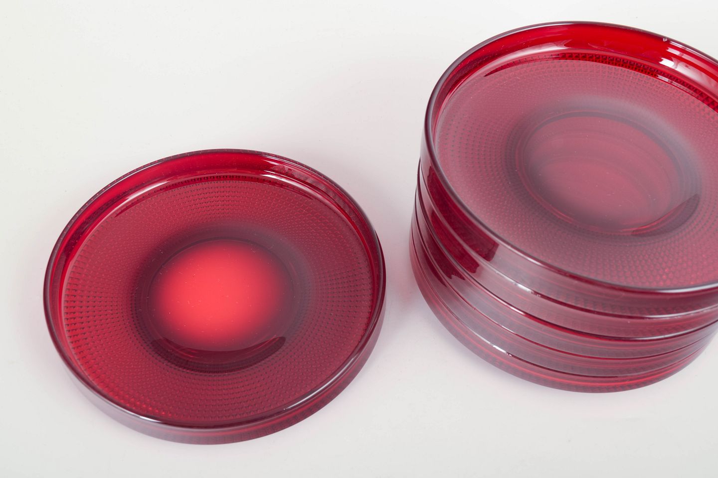 Set of six flat plates in deep ruby-red glass from Gullaskruf, model “Vineta,” recognised for its distinctive optical dotted structure and rich colour saturation. A refined and iconic example of Swedish mid-century glass design.