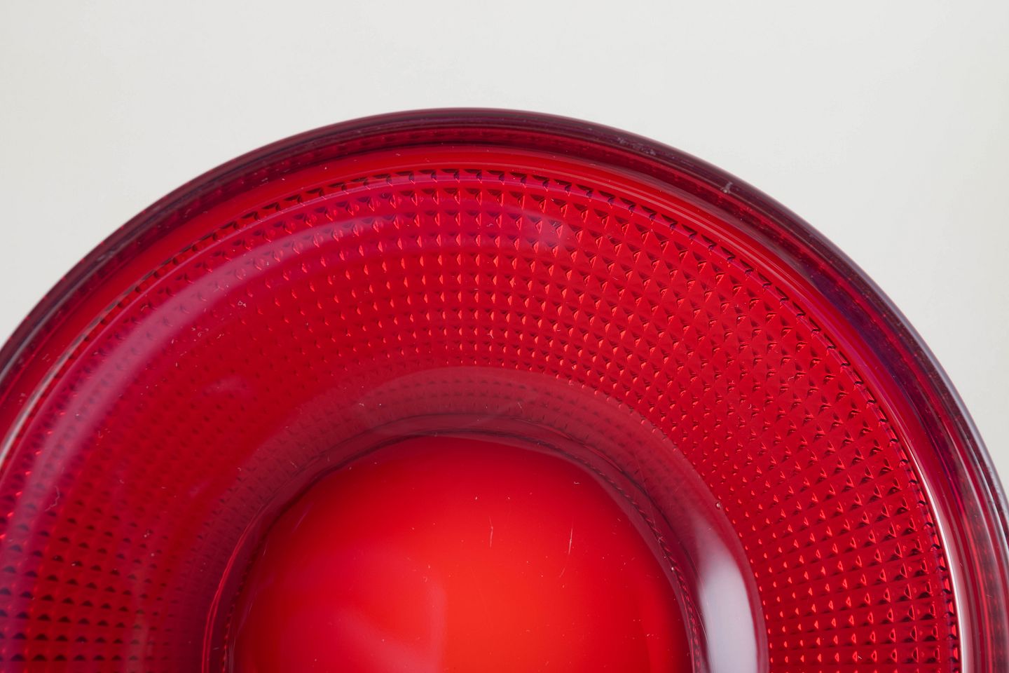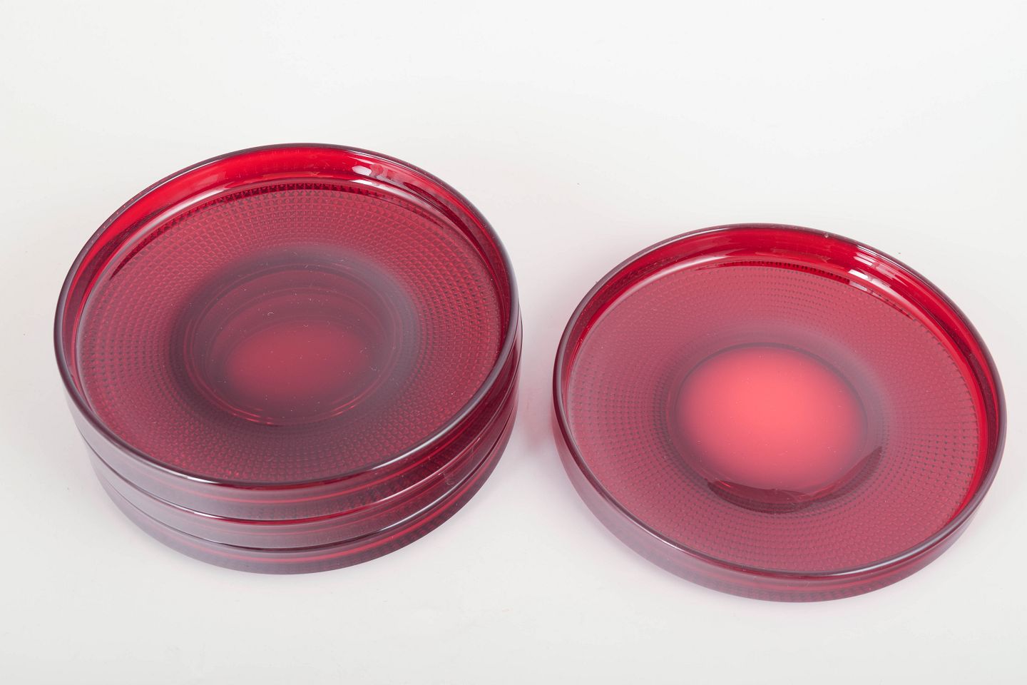 Set of four flat plates in ruby-red art glass from Gullaskruf, model “Vineta,” distinguished by its optical dotted structure and deep colour saturation. A refined and iconic example of Swedish mid-century glass design.