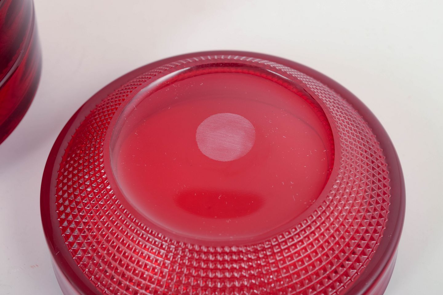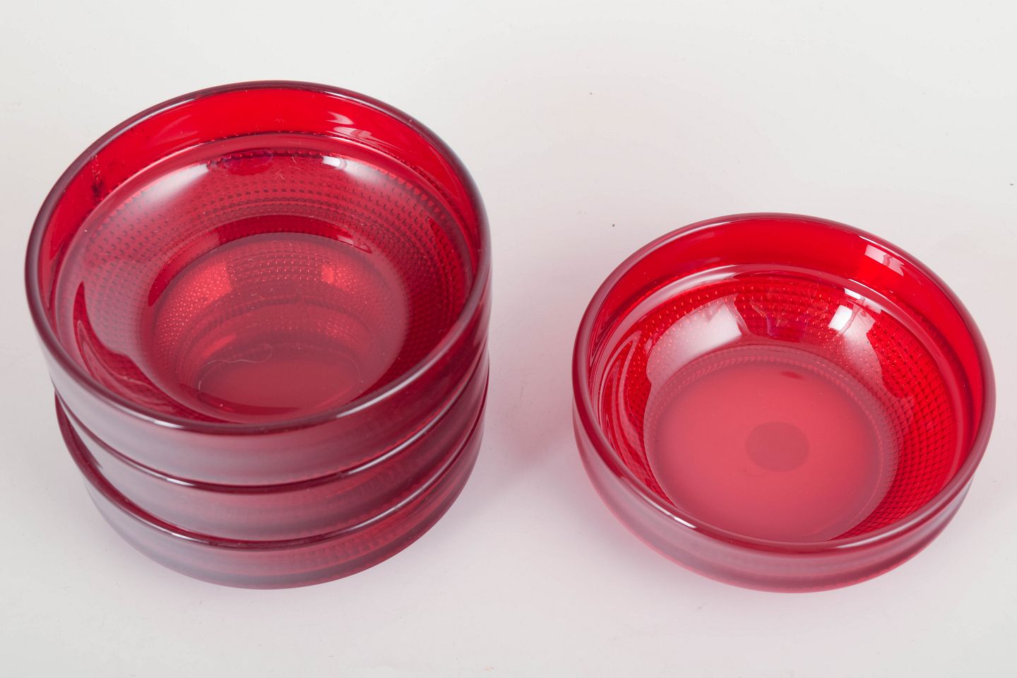 Set of four deep bowls in ruby-red art glass from Gullaskruf, model “Vineta,” known for its optical texture and intense colour saturation. A refined example of mid-century Swedish glass design.