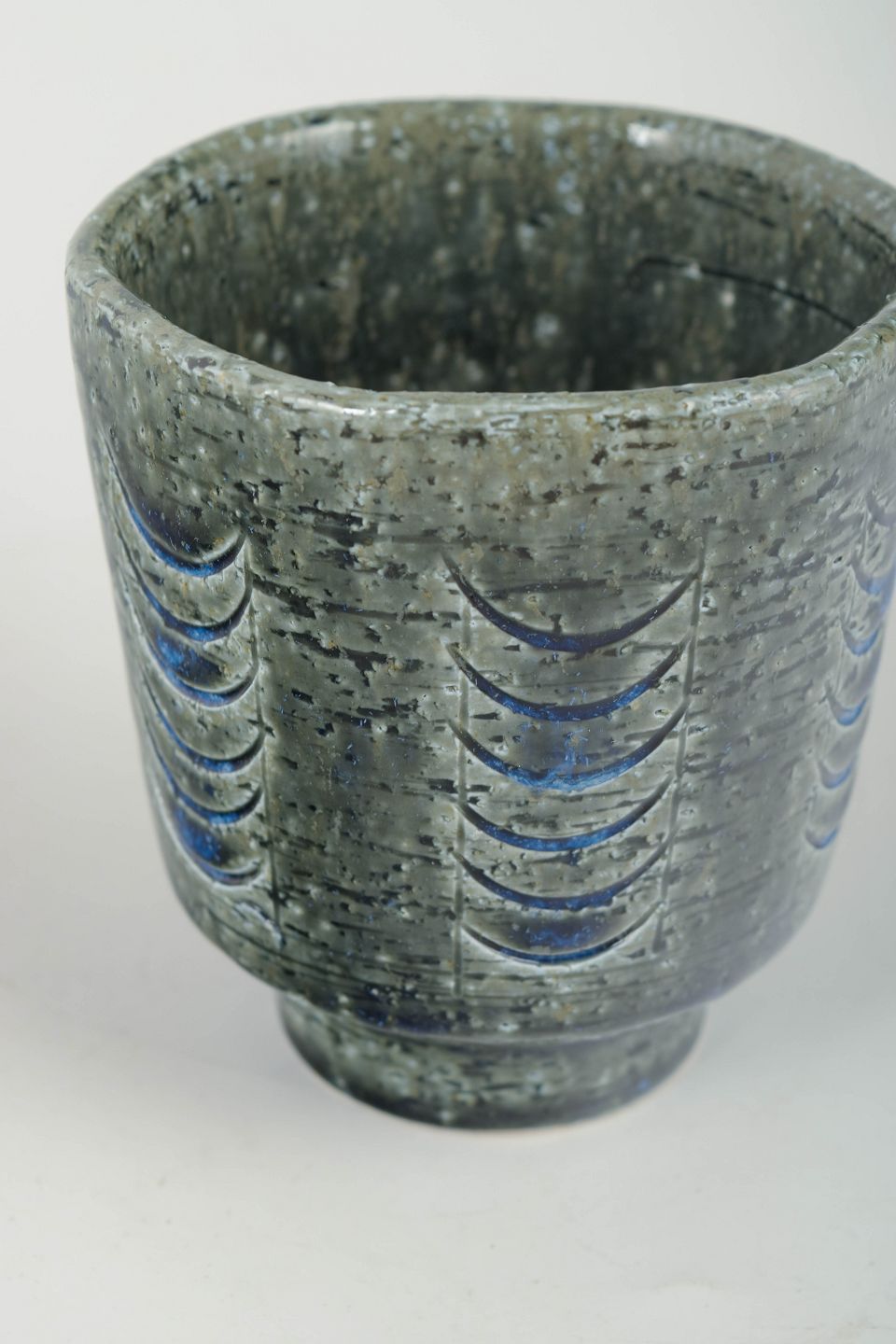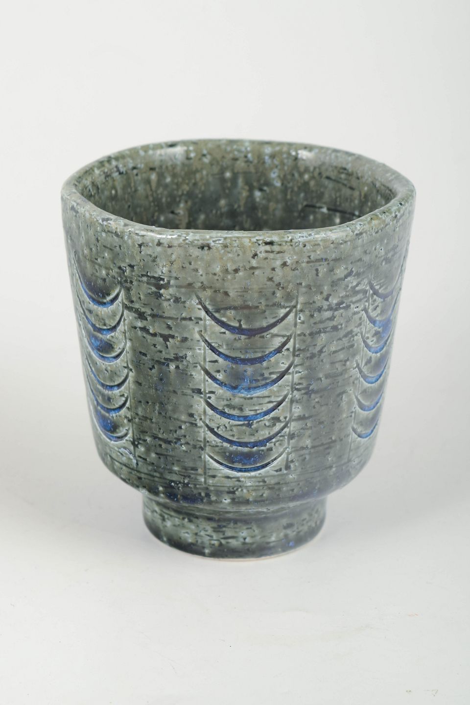 Annelise and Per Linnemann-Schmidt for Palshus – Vase, 1970s.Small cylindrical stoneware vase with incised arc motifs in blue tones and the characteristic Palshus ash glaze. Signed.