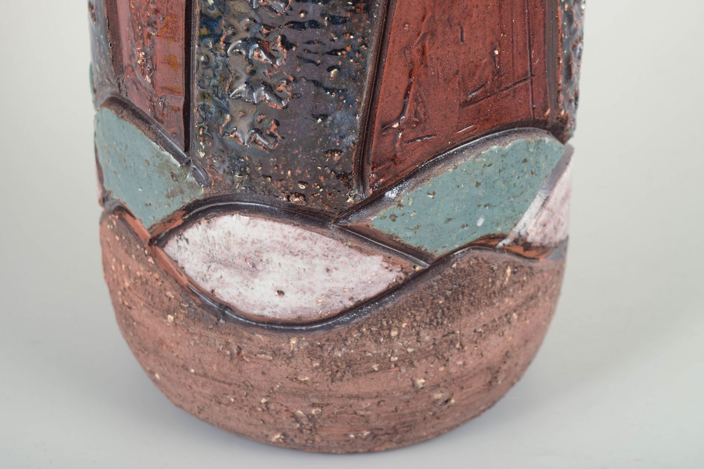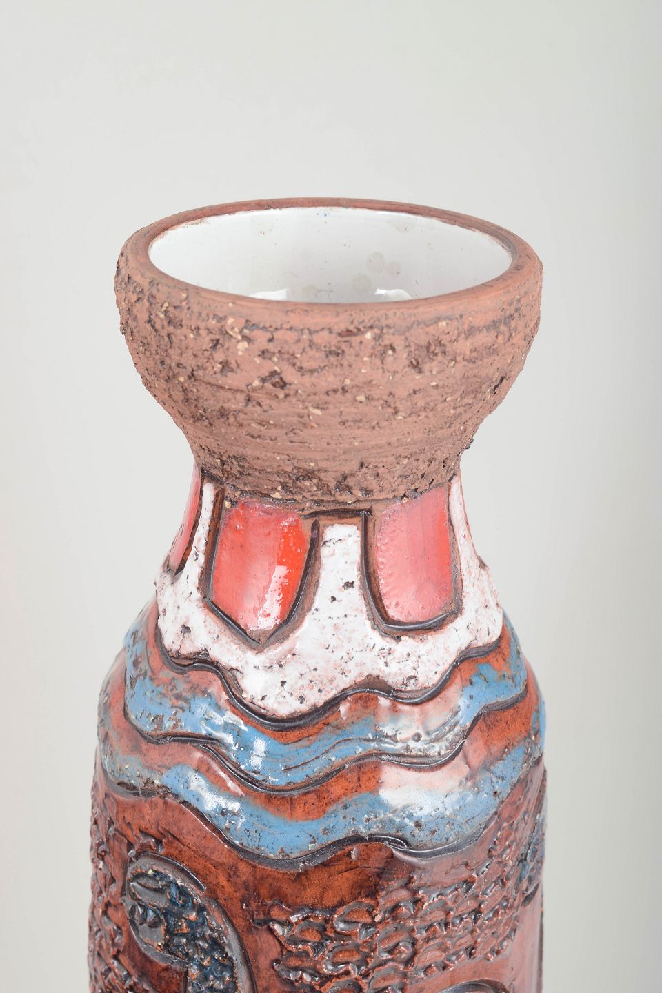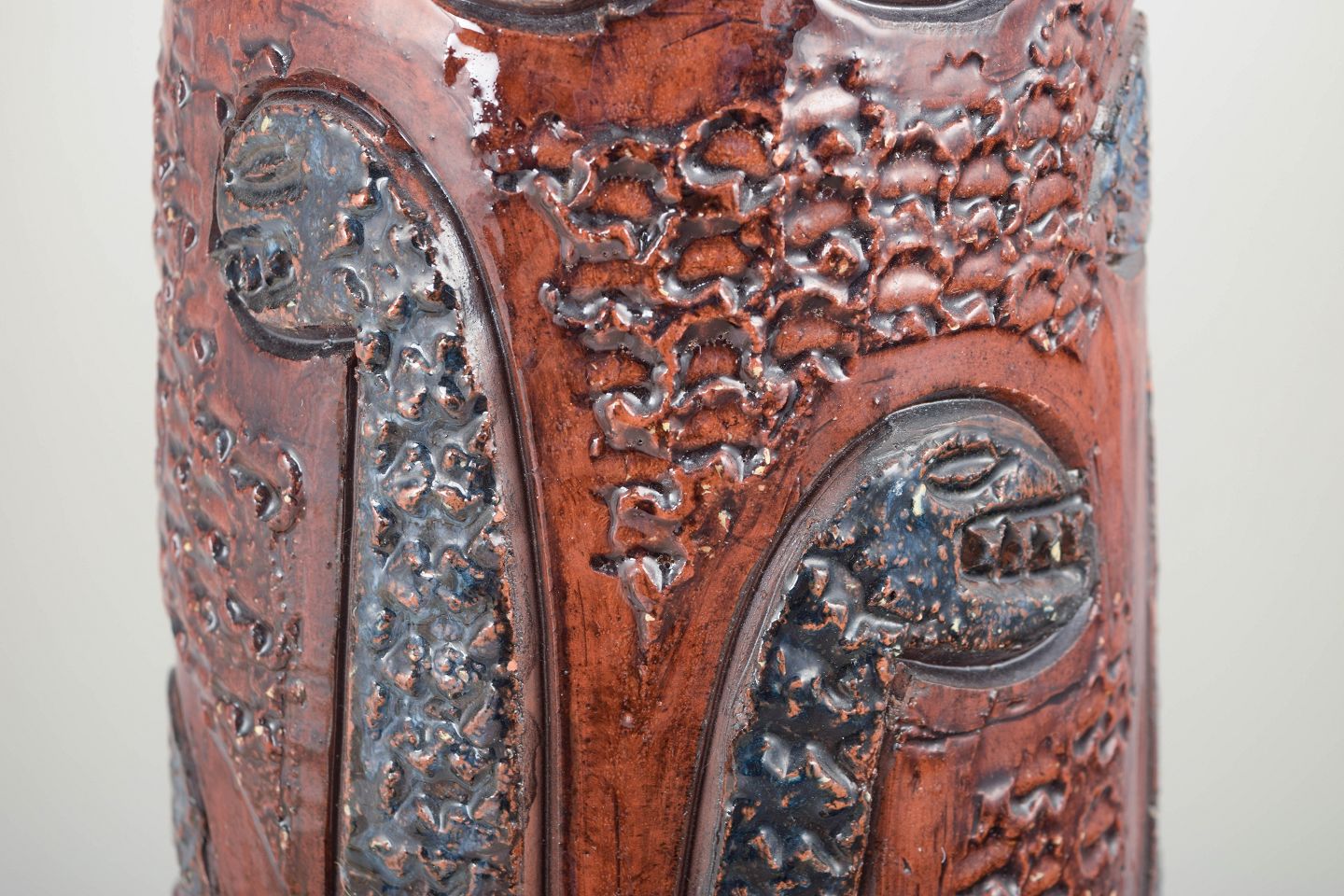Impressive chamotte floor vase with heavily modelled relief work and decorative glazes in reddish-brown, blue, turquoise and white tones. The front features stylised ascending dragon figures – a characteristic motif in Zawadzki’s 1960s production.
