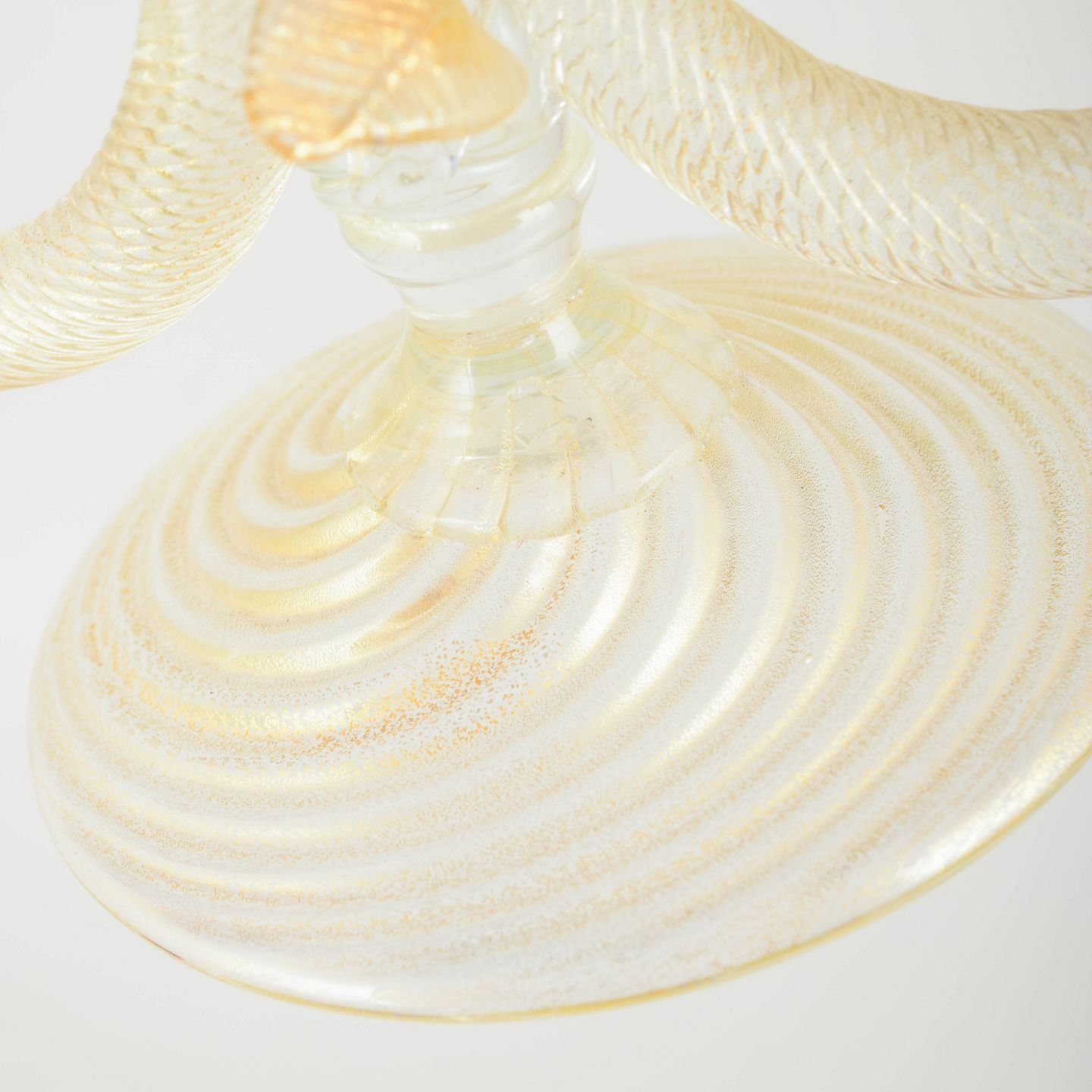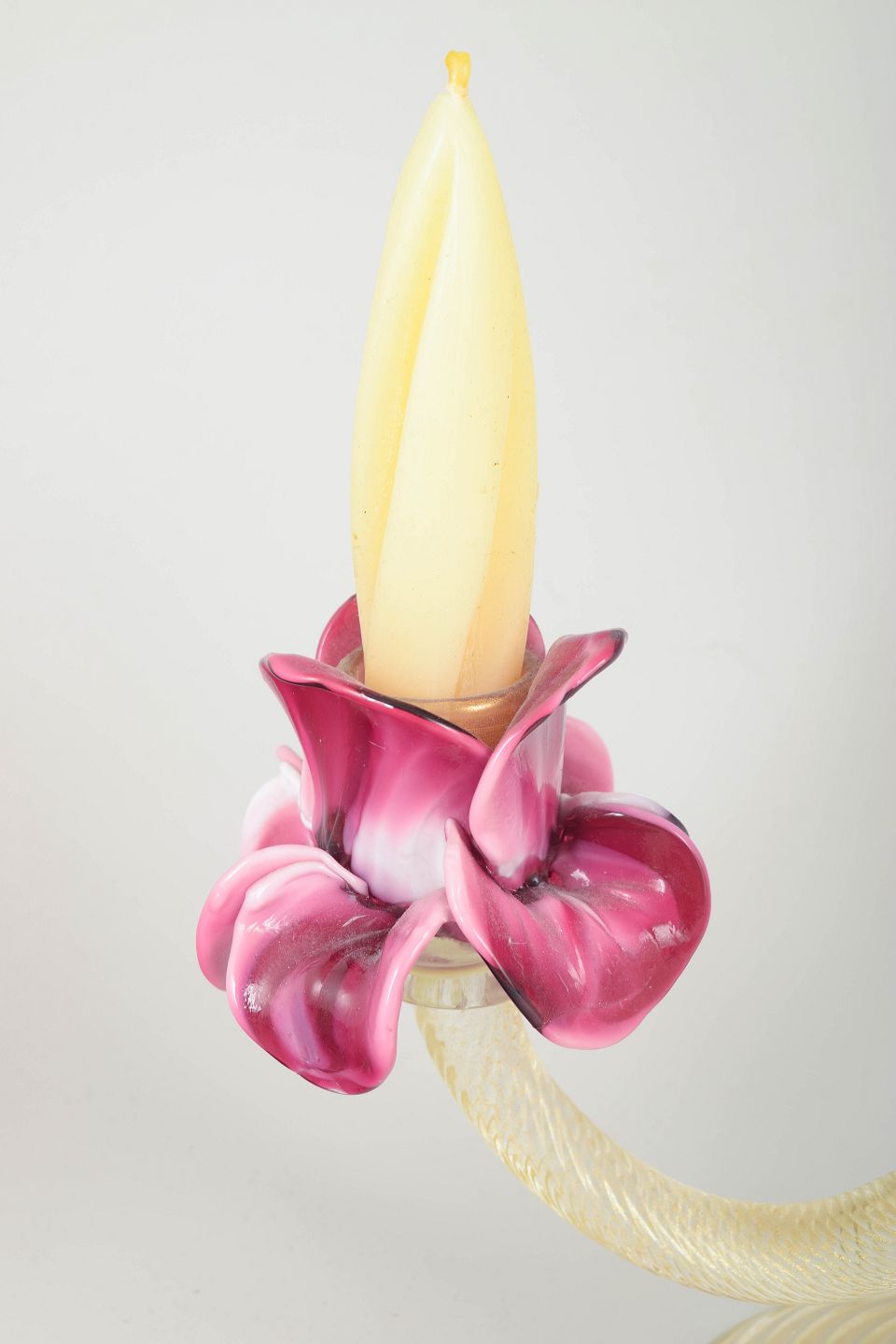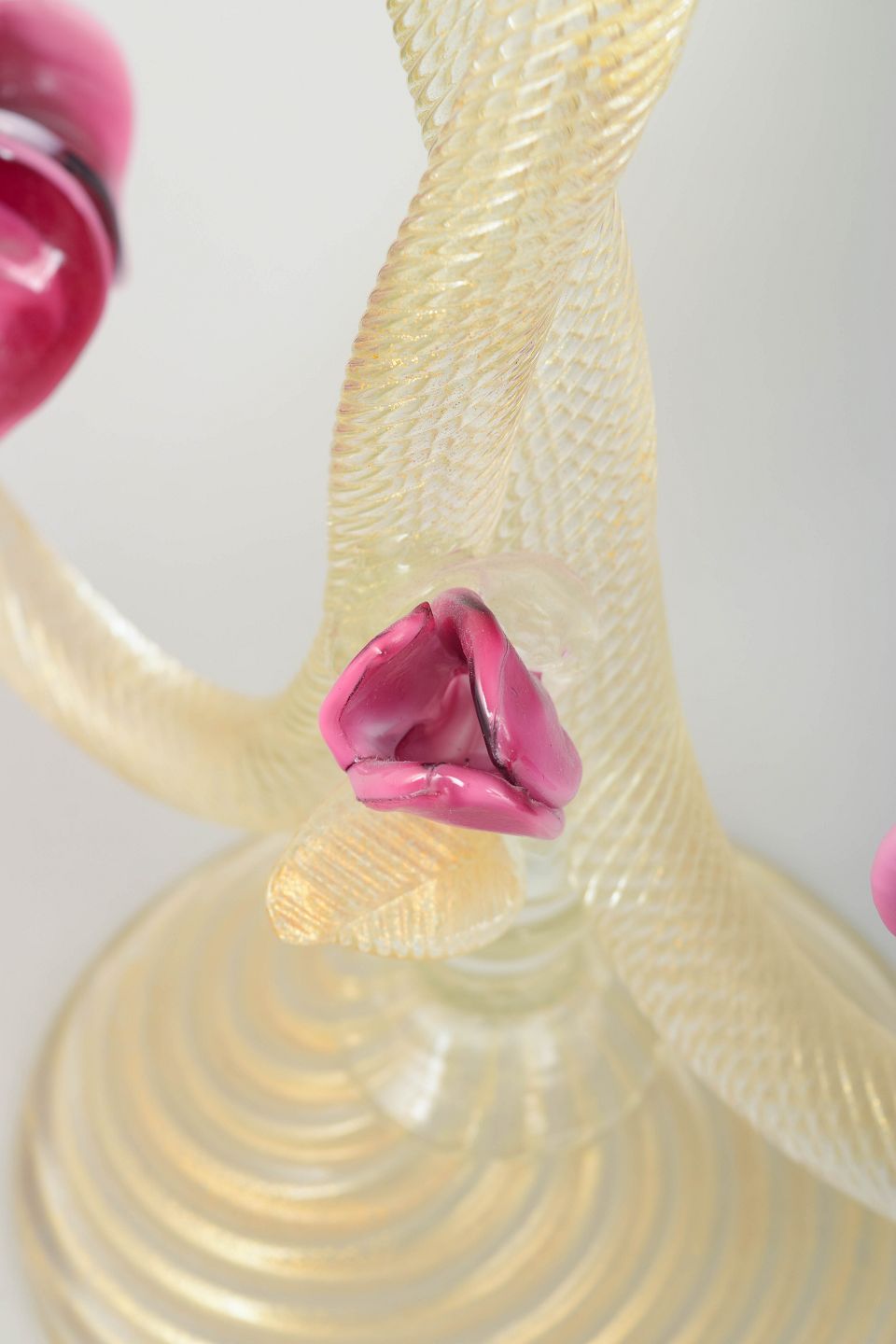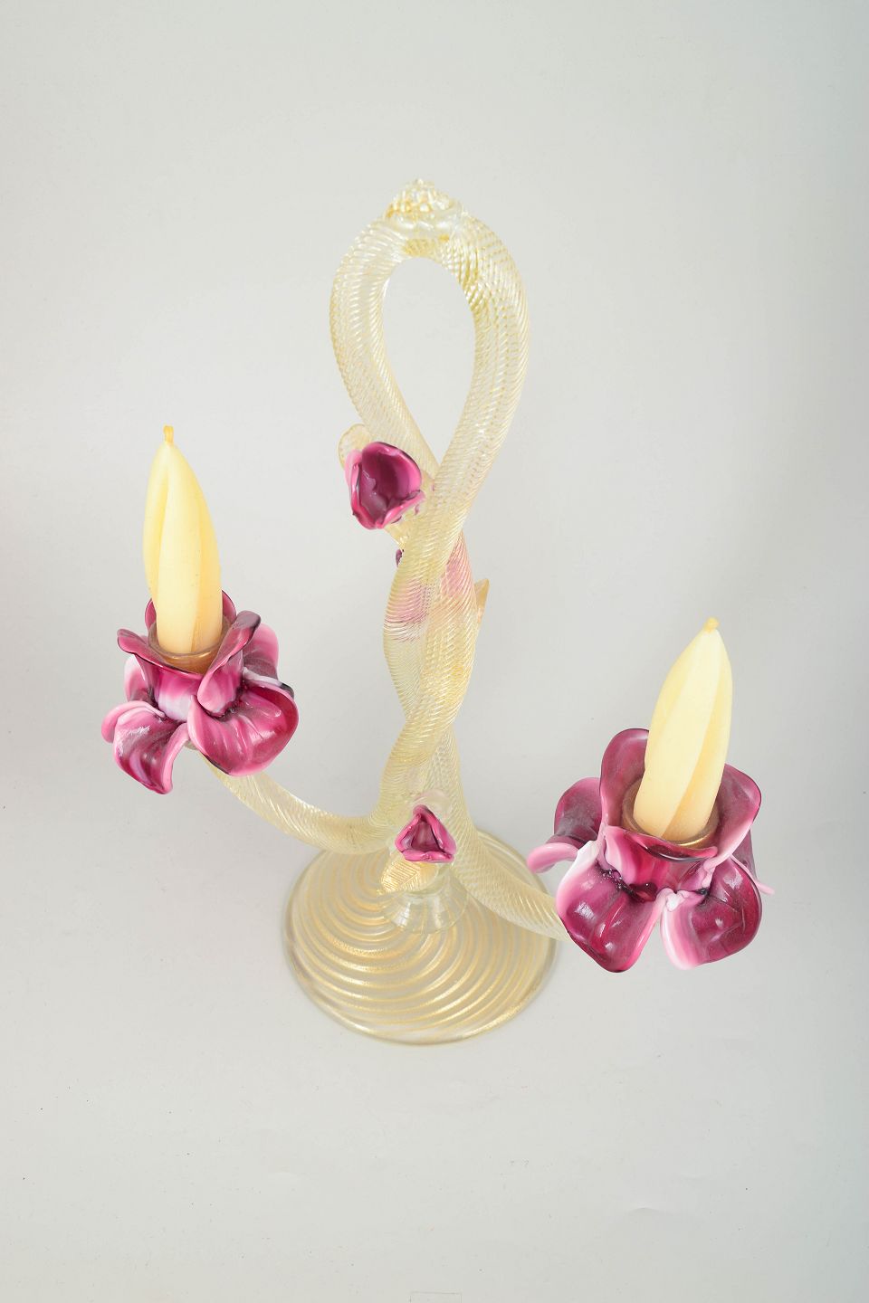 Impressive mouth-blown Murano candlestick with two candle holders, crafted in clear spiral glass with gold dust (avventurina) and floral appliqués in deep pink and purple tones. An elegant, sculptural piece of Italian glass design from the 1960s.