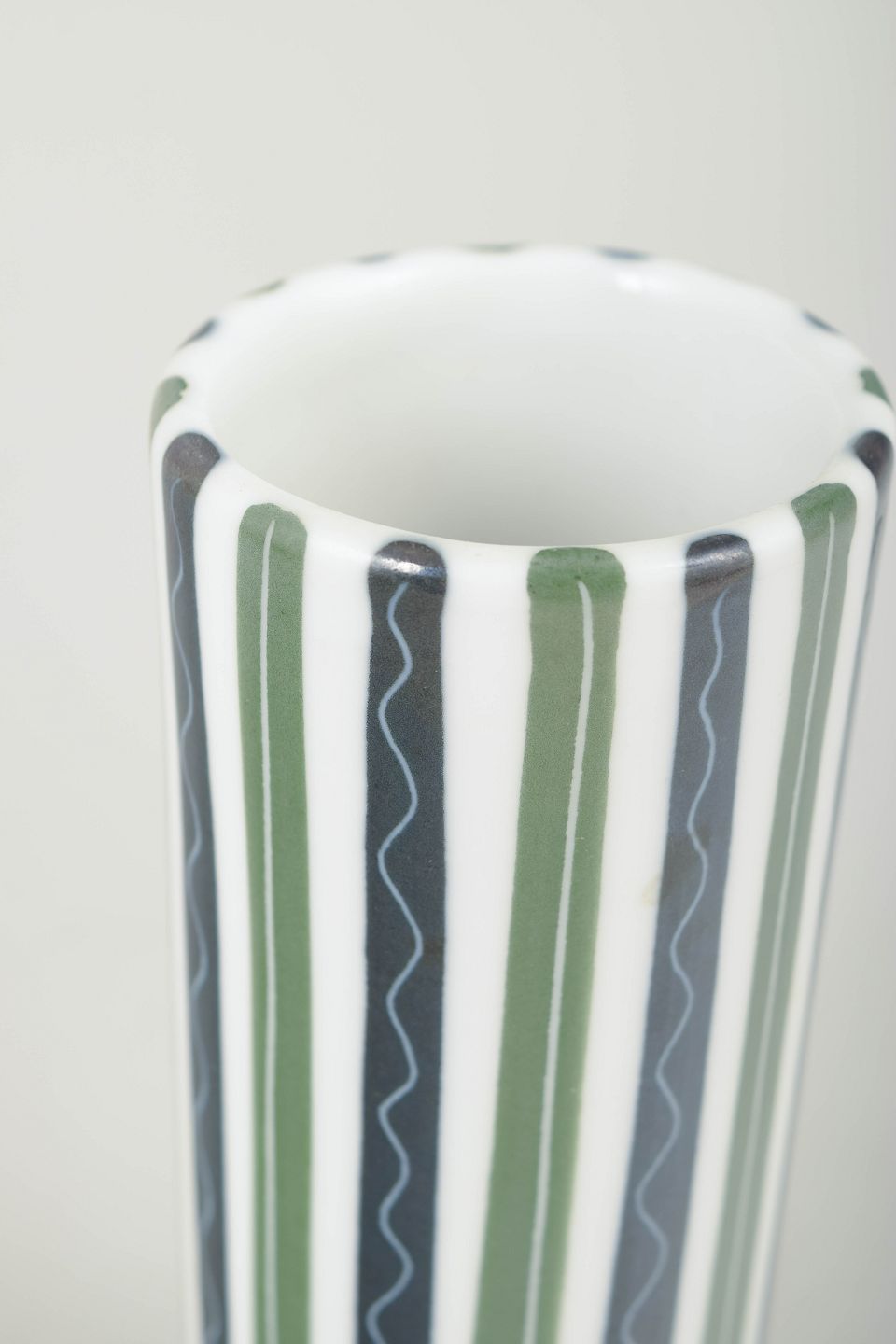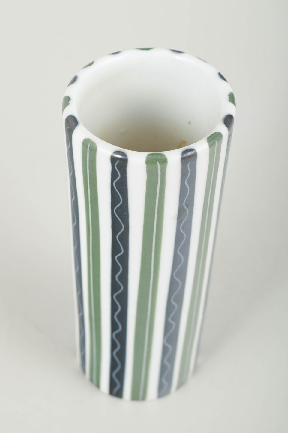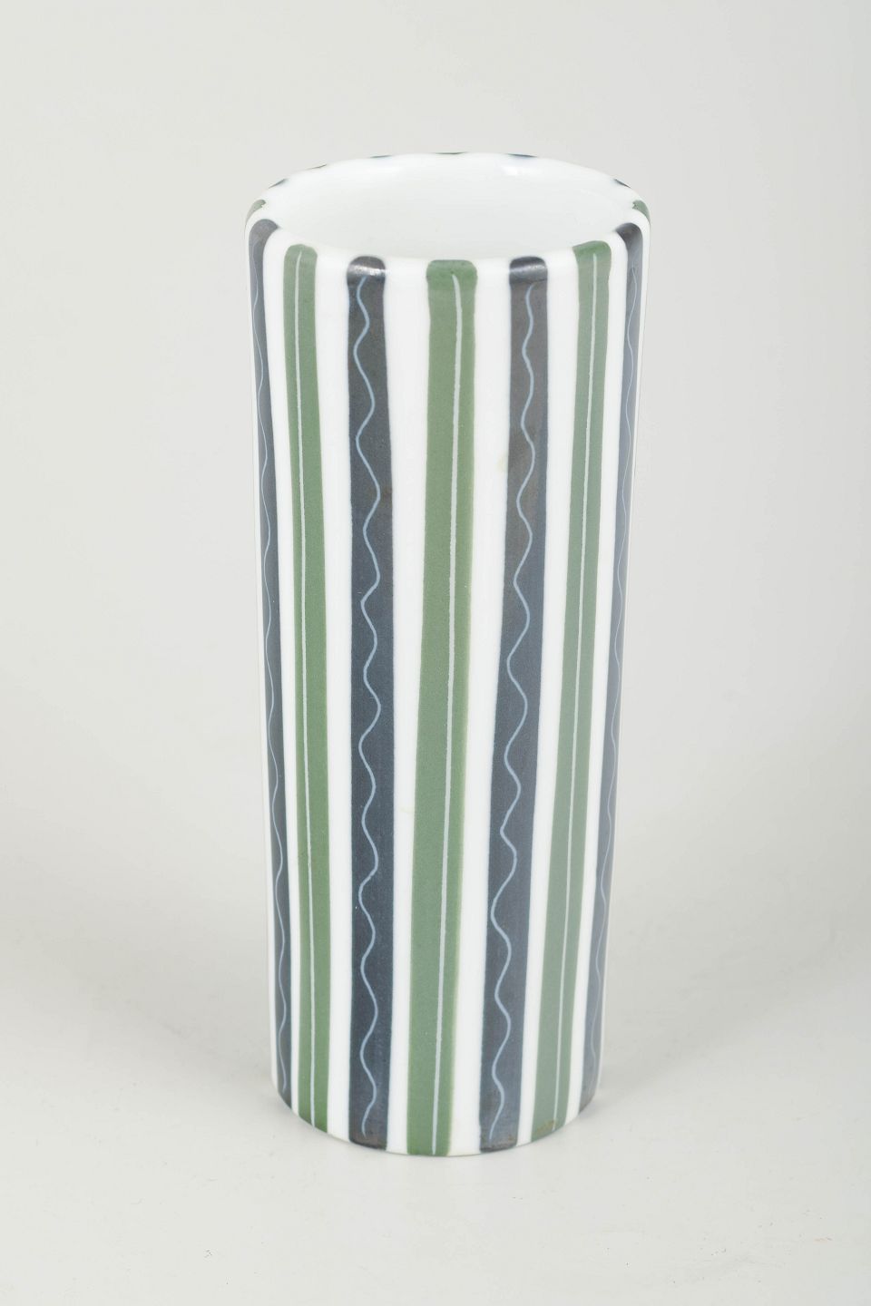 Cylindrical ceramic vase with classic hand-painted striped décor in green, grey and white tones.