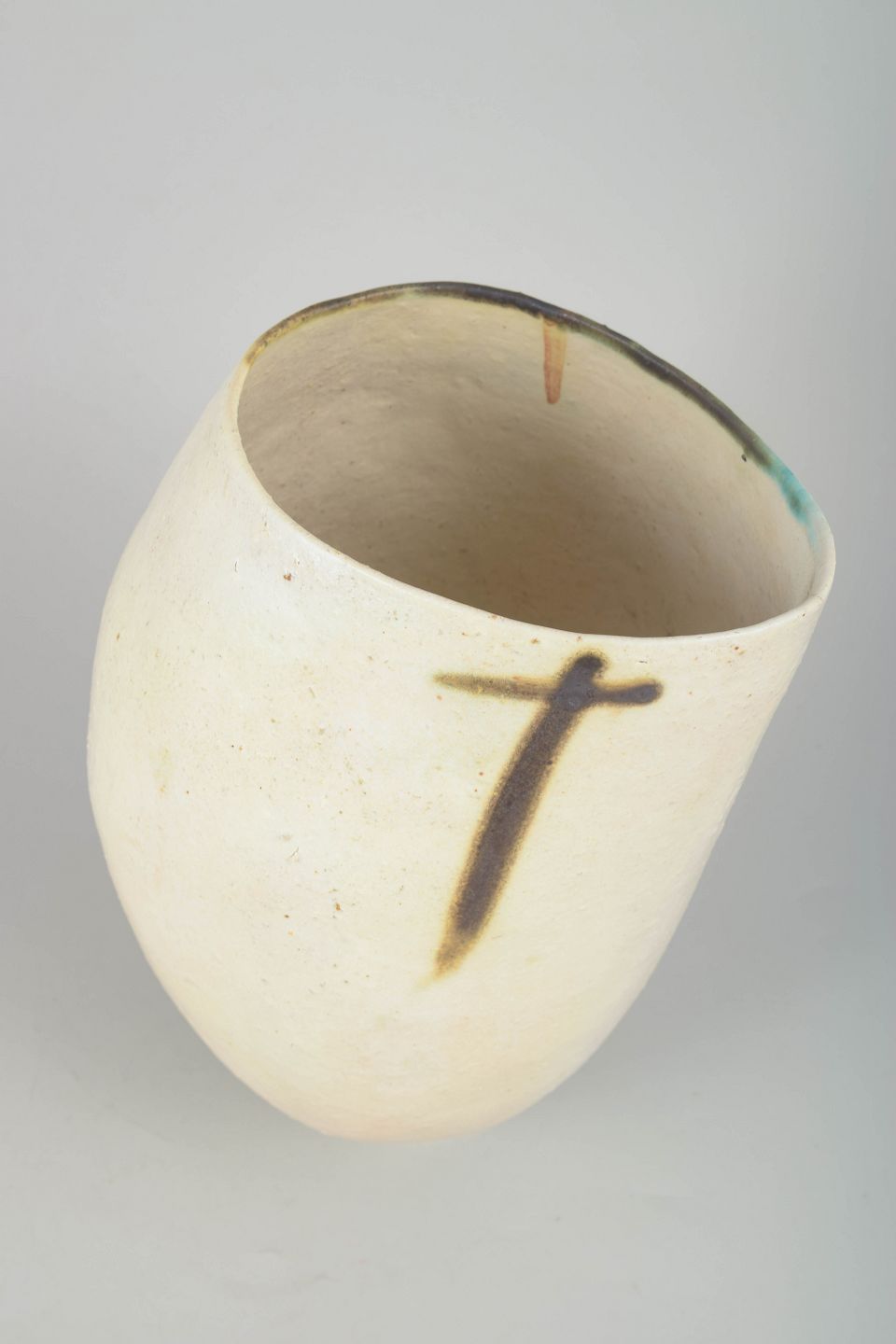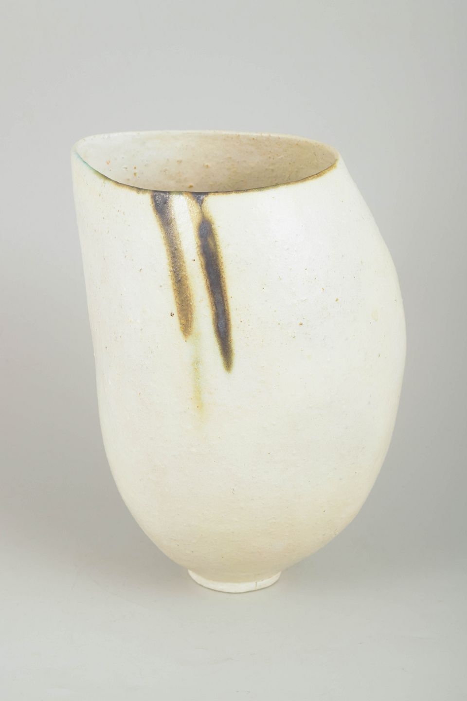 Sculptural, hand-built studio vase in stoneware with a subtly asymmetric form, raw white surface, and minimalist brushstroke decoration in dark brown and black tones. A distinctive and unique artistic ceramic work from the period.