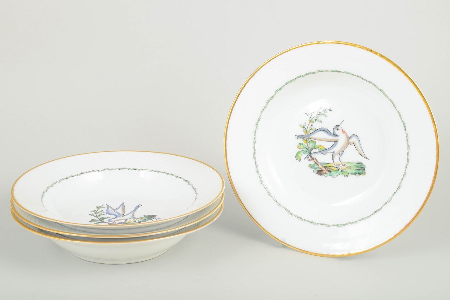 Royal Copenhagen – Set of four large deep plates, early 20th century.Rare deep porcelain plates by Royal Copenhagen featuring a bird and botanical motif (model 550/8107). Each plate has a gilded rim and a refined basket-weave relief along the edge.