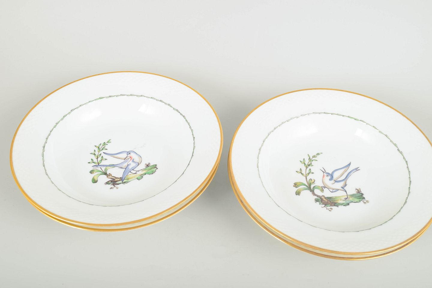 Royal Copenhagen – Set of four large deep plates, early 20th century.Rare deep porcelain plates by Royal Copenhagen featuring a bird and botanical motif (model 550/8107). Each plate has a gilded rim and a refined basket-weave relief along the edge.