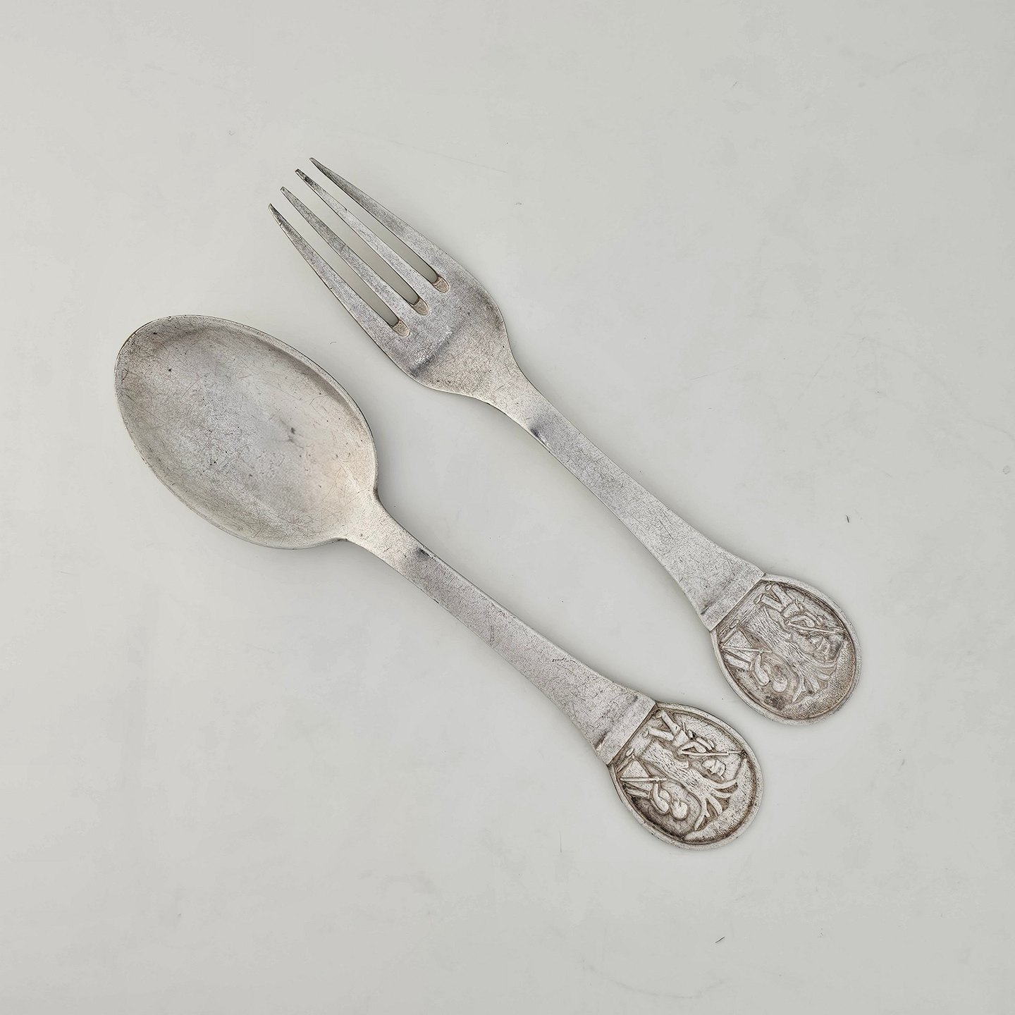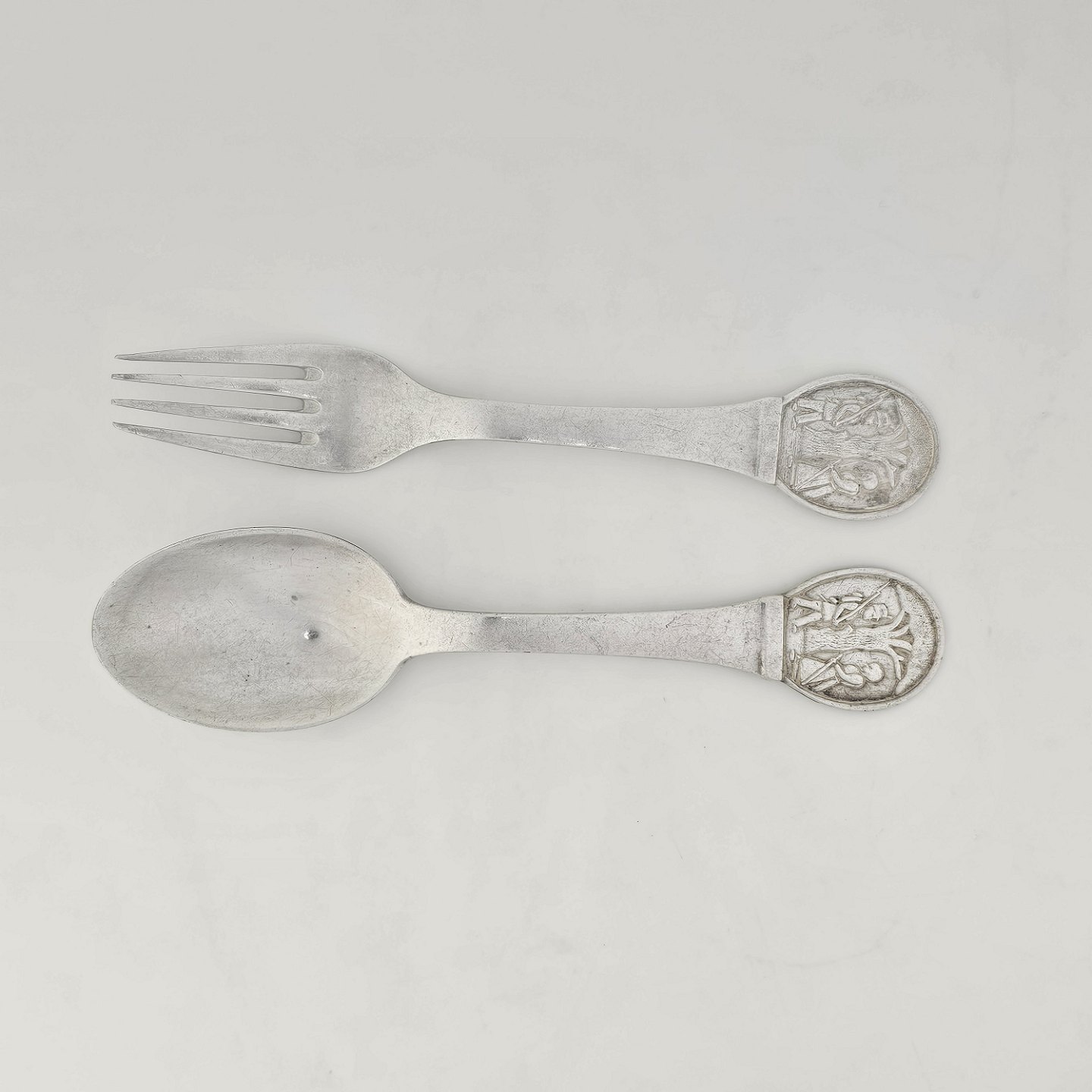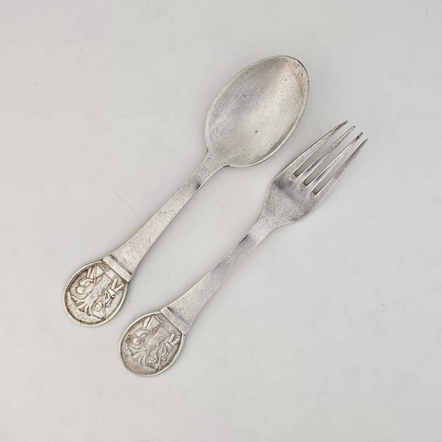 Gaffel og ske af pletsølv med motiv af H.C. Andersens FyrtøjetProducent CJS Prima