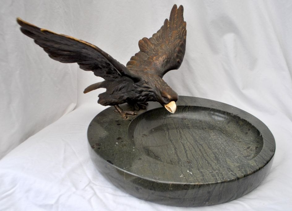 Large French bronze eagle mounted on a marble dish, art nouveau, circa 1900. Eagle with spread wings and ivory beak. Marble platter in green. Platter dia: 35 cm. Eagle: W: 40 cm. H.: 23 cm.Truly amazing piece!