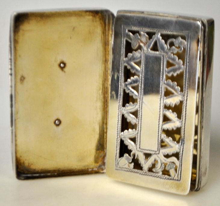 Carl Christopher Rode (1826 - 1902) Åbenrå, Denmark: Silver scent box. Stamped with master's mark and town seal. Inside gilded and lattice with acorns and oak leaves. 7.5 x 4.5 x 1.5 cm. Weight: 68 grams.On the lid engraving: HP Hansen 1858.