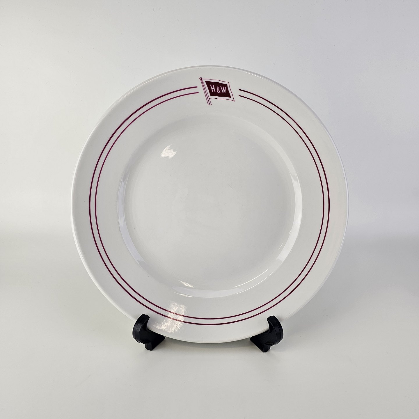 Sæt hotelporcelæn af flade middagstallerkener, flade frokosttallerkener og dybe tallerkener i kongeligt porcelæn dekoreret med røde streger og logoet for Holm & Wonsilds rederiProducent Royal Copenhagen