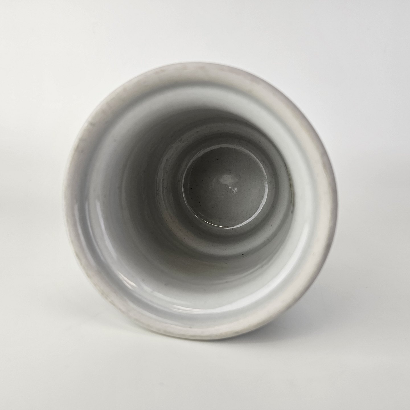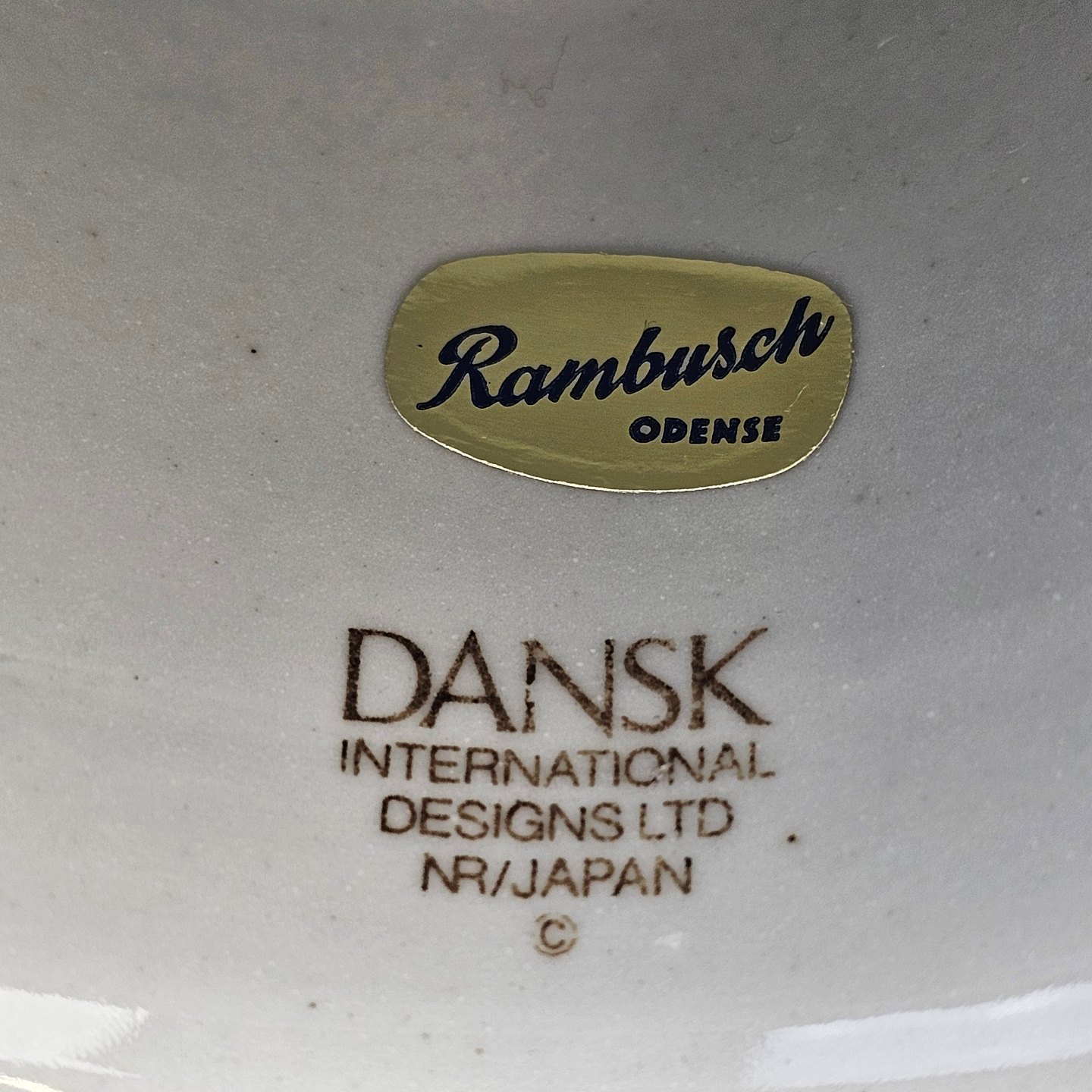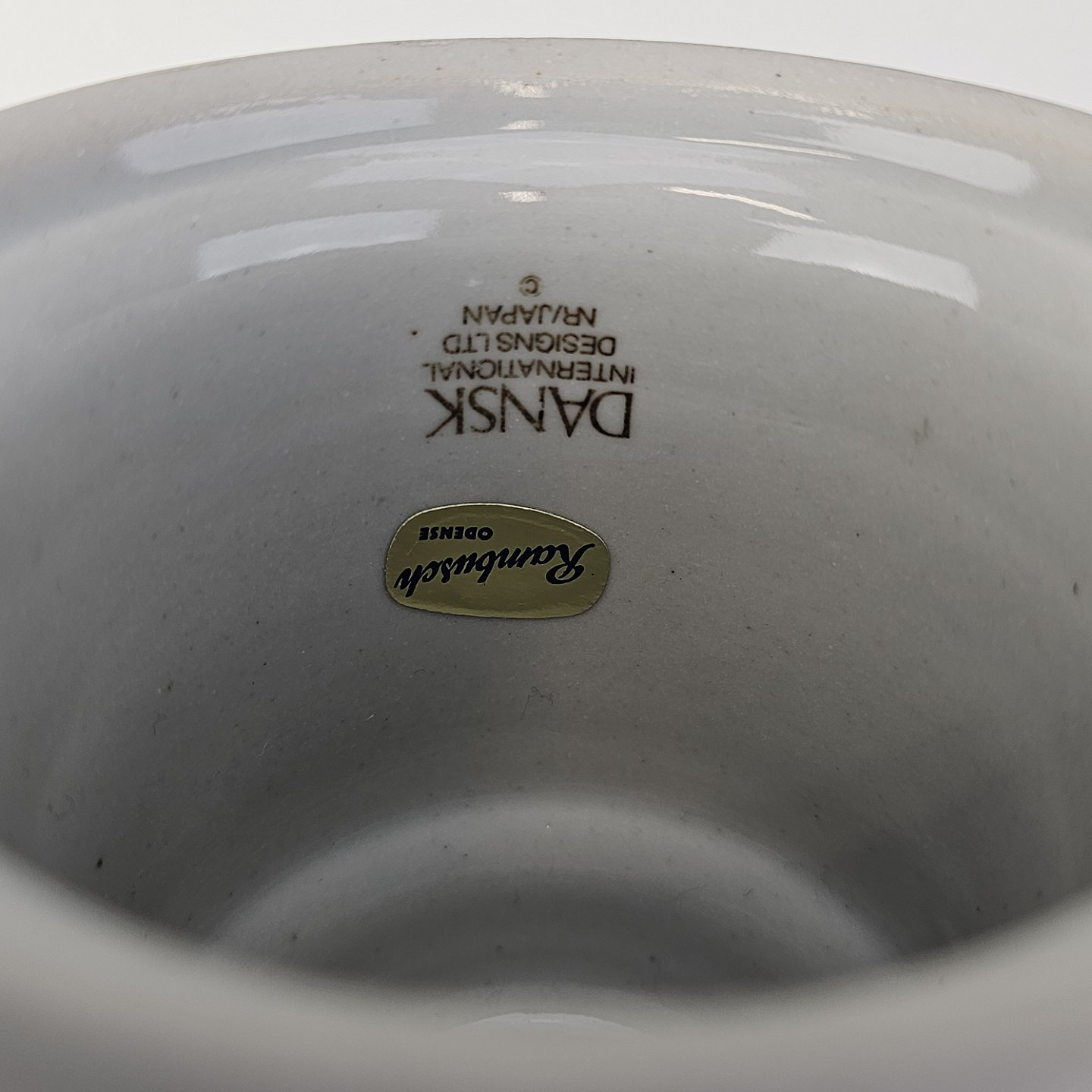Krukke i glaseret stentøj med dekoration af tre blå striberFormgiver Niels Refsgaard
