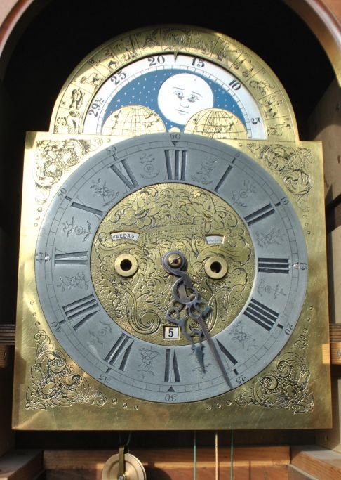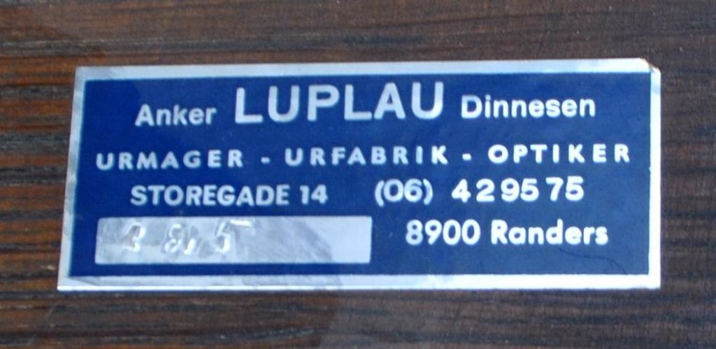 Danish grandfather clock, 20th century. Clock manufacturer and watchmaker Anker Luplau Dinesen, Randers. No.: 325. Grandfather clock in mahogany with clock case with quarter columns. Clock movement with moon phase and calendar with months and date. With hour hands. Brass dial with Roman numerals. H.: 210 cm. W.: 44 cm. D.: 24 cm.Perfect condition!