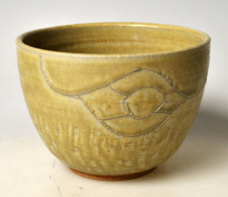 Hjorths ceramics, 20th century. Bornholm, Denmark. Unique bowl. Stoneware. With decoration on the sides. Gray-green glaze. Stamped: BM and mark from Hjorth. H.: 8 cm.Item number: 28658