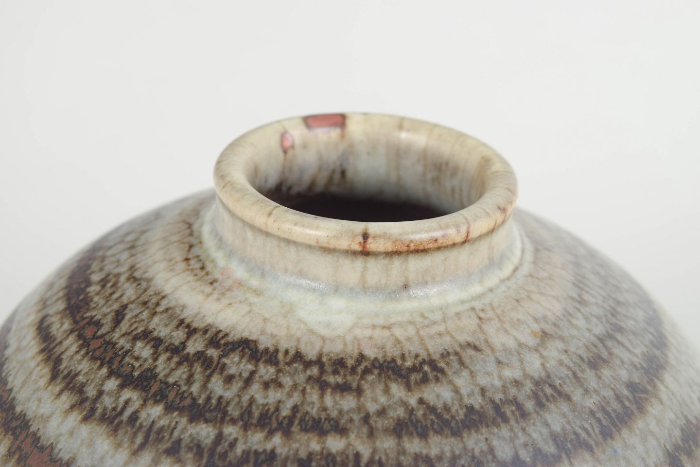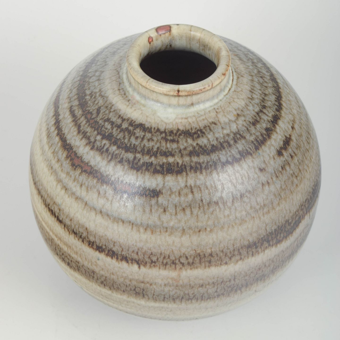 Saxbo, large stoneware vase, early mark, 1930s.Large spherical stoneware vase from Saxbo with an early workshop mark, produced in the 1930s. The piece features a beautiful flowing hare’s-fur/striped glaze in shades of brown, grey and beige, characteristic of Saxbo’s early experimental high-fired glazes.