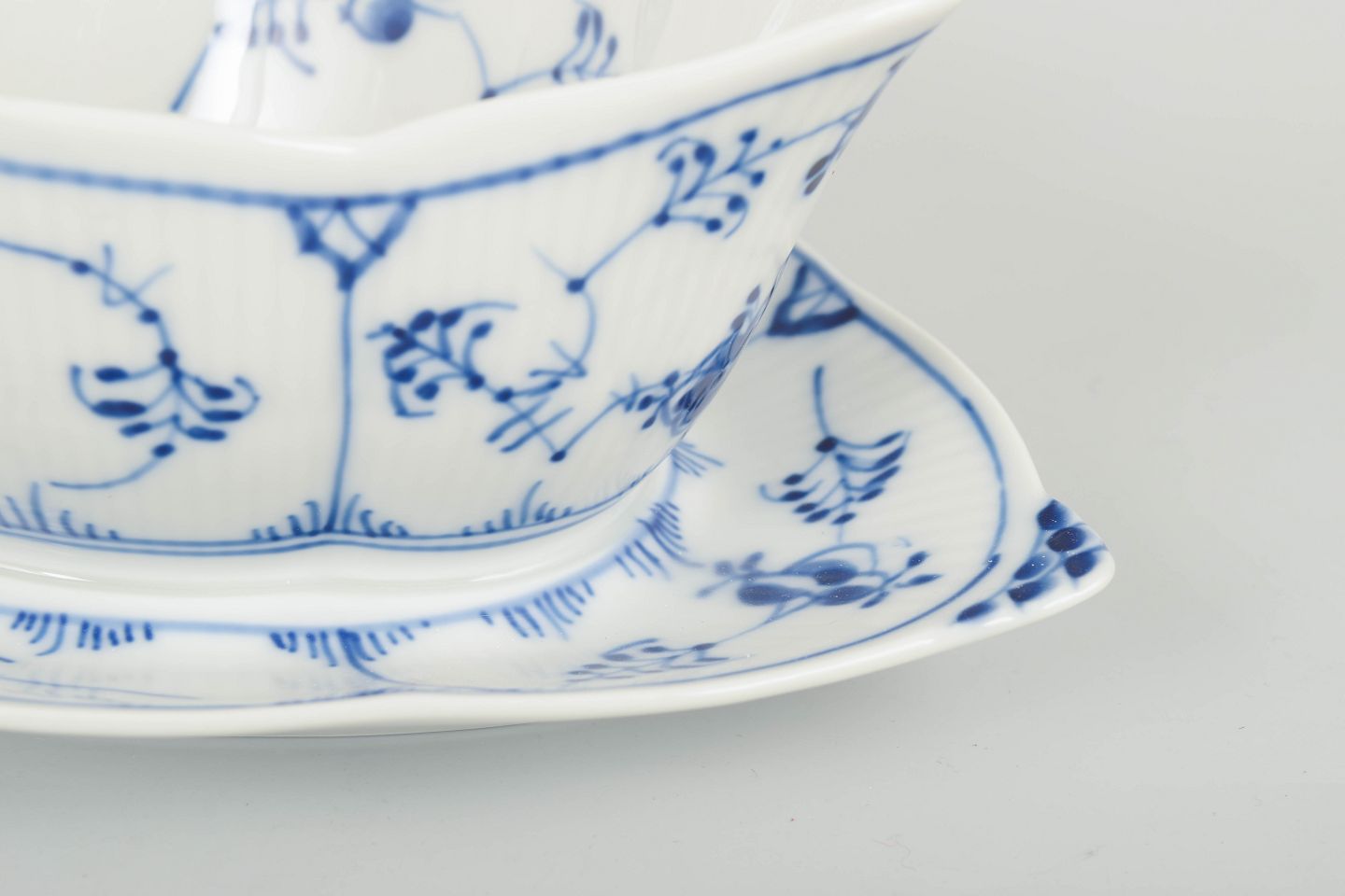Classic sauce boat in the “Blue Fluted Plain” porcelain series with separate underplate. The form is gently curved with a softly faceted rim and hand-painted cobalt-blue decoration on a fluted body. A well-preserved piece from Royal Copenhagen’s late 20th-century production.