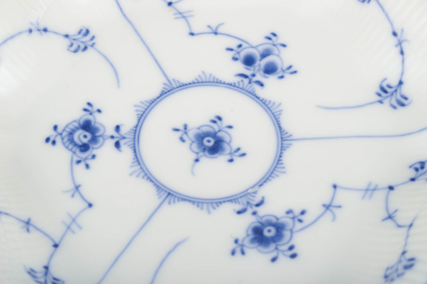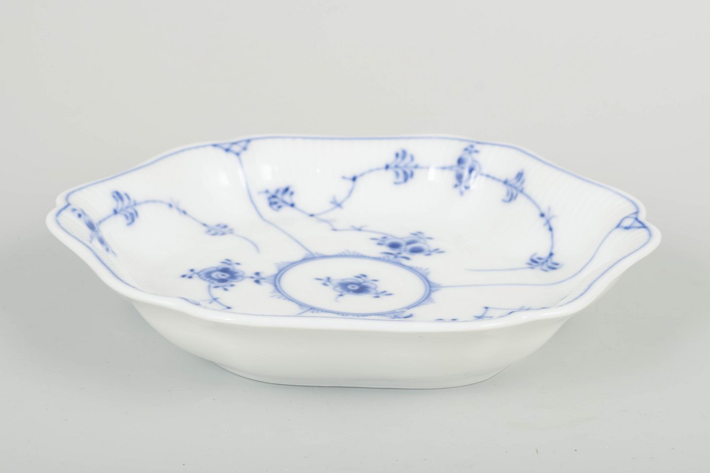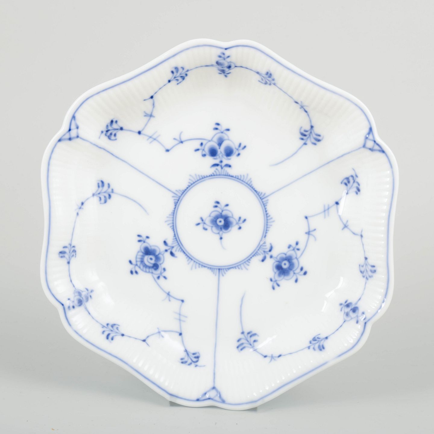 Elegant dish in the “Blue Fluted Plain” porcelain series with a gently scalloped, six-sided form. Decorated with hand-painted cobalt-blue floral on the fluted body – a fine example of Royal Copenhagen craftsmanship from the early 20th century.